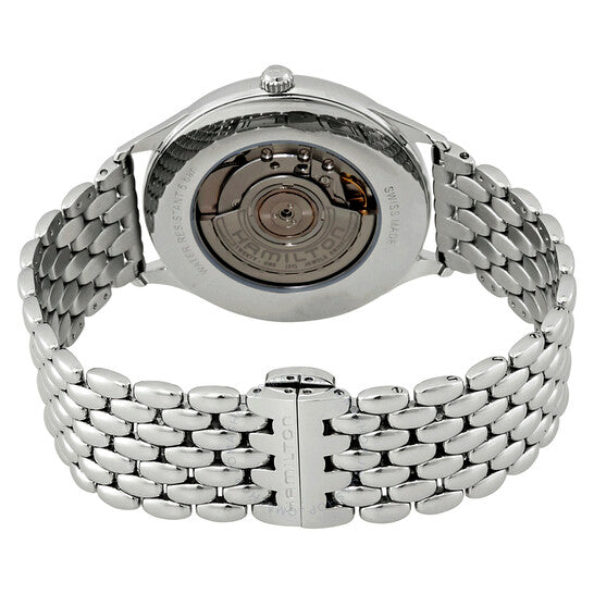 علبة من الفولاذ المقاوم للصدأ مع سوار من الفولاذ المقاوم للصدأ. إطار ثابت من الفولاذ المقاوم للصدأ. ميناء بلون الأنثراسيت مع عقارب مضيئة فضية اللون وعلامات ساعات. علامات دقائق حول الحافة الخارجية. نوع الميناء: تناظري. عقارب مضيئة. نافذة عرض التاريخ عند موضع الساعة السادسة. حركة أوتوماتيكية من عيار ETA 2892-A2، مبنية على ETA 2890، تحتوي على 21 جوهرة، تنبض بمعدل 28800 ذبذبة في الساعة، ولديها احتياطي طاقة يدوم حوالي 42 ساعة. زجاج ياقوت مقاوم للخدش. غطاء خلفي شفاف. شكل دائري. حجم العلبة: 40 مم. سمكها: 8.45 مم. عرض السوار: 20 مم. مشبك قابل للطي بزر ضغط. مقاومة للماء حتى عمق 50 مترًا / 165 قدمًا. الوظائف: التاريخ، الساعة، الدقائق. سلسلة Jazzmaster Thinline. تصميم ساعة كاجوال. علامة الساعة: صناعة سويسرية. ساعة هاميلتون جازماستر ثينلاين أوتوماتيكية بمينا أنثراسيت للرجال H38525181.