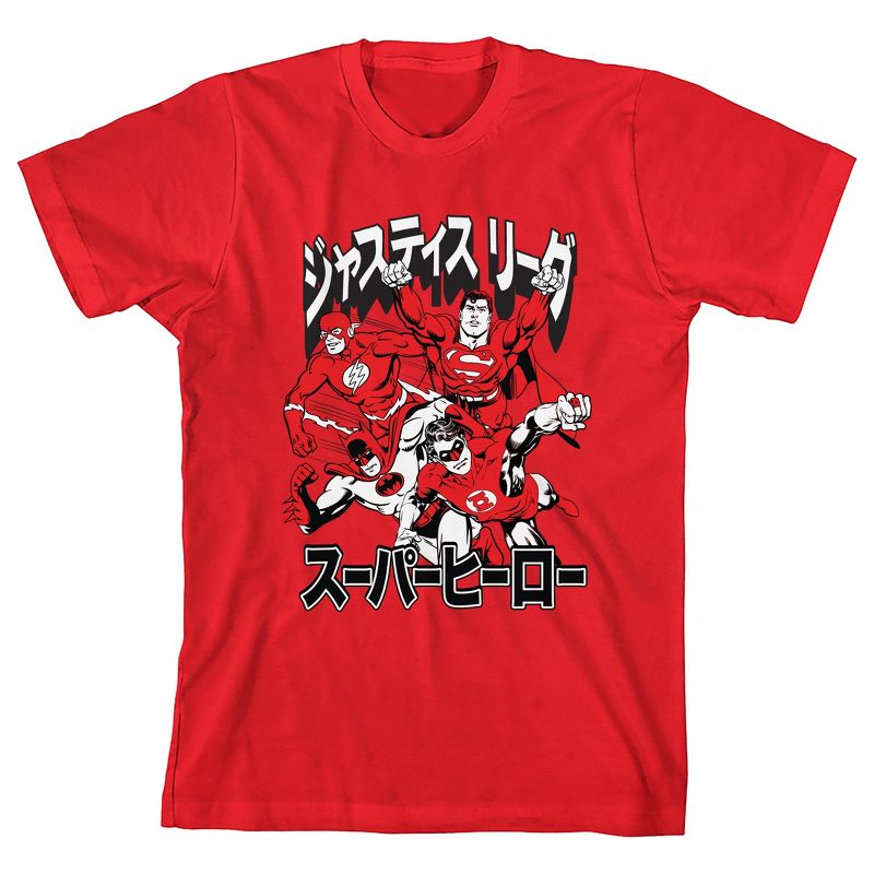 - تيشيرت برسومات جرافيكية: يظهر سوبرمان وفلاش والفانوس الأخضر بأزياء حمراء على هذا التيشيرت الجرافيكي، بينما يرتدي باتمان بدلة بيضاء. طُبعت أحرف كانجي باللونين الأبيض والأسود فوق الأبطال الخارقين وأسفلهم.