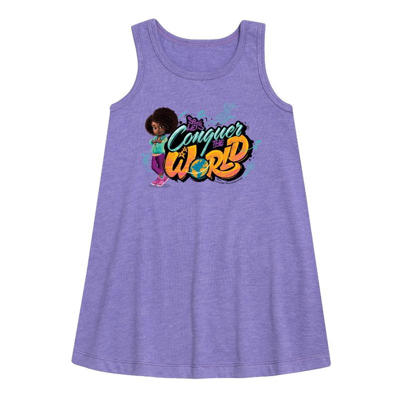 عالم كارما - غزو العالم - فستان بقصة A للفتيات الصغيرات والشابات - انطلقي في رحلة التعبير عن الذات والثقة مع ملابس جرافيكية مستوحاة من عالم كارما. تتميز كل قطعة بتصاميم نابضة بالحياة، ورسائل ملهمة، وشخصيات من المسلسل الشهير، وتحتفل بالإبداع والتفرد وقوة الكلمات. مثالية لعشاق كارما وموسيقاها، تضفي هذه المجموعة لمسة من الإيجابية والأناقة على كل إطلالة ولحظة.