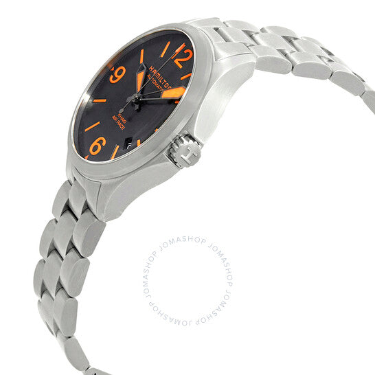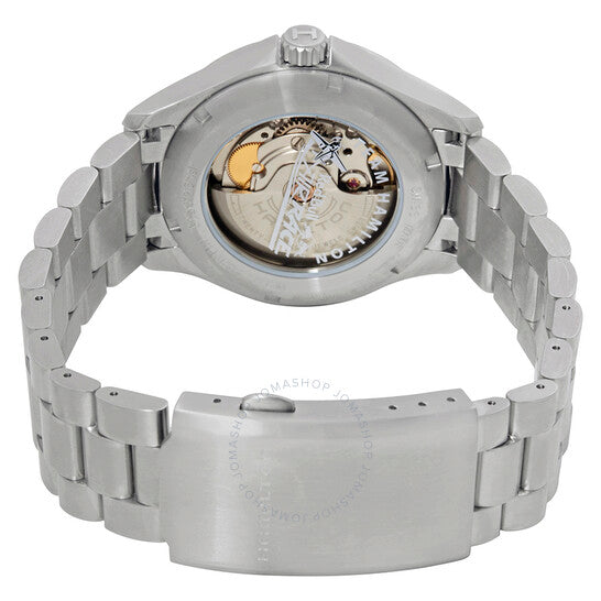 علبة فضية اللون من الفولاذ المقاوم للصدأ مع سوار فضي اللون من الفولاذ المقاوم للصدأ. إطار ثابت فضي اللون من الفولاذ المقاوم للصدأ. ميناء أسود بعقارب ومؤشرات ساعات سوداء مضيئة. أرقام عربية تشير إلى مواقع الساعات 3 و6 و9 و12. علامات دقائق حول الحافة الخارجية. نوع الميناء: تناظري. عقارب ومؤشرات مضيئة. عرض التاريخ بين موقعي الساعة 4 و5. حركة هاميلتون كاليبر H-10 أوتوماتيكية، مبنية على ETA C07.111، تحتوي على 25 جوهرة، تنبض بمعدل 21600 ذبذبة في الساعة، ولديها احتياطي طاقة لمدة 80 ساعة تقريبًا. زجاج ياقوت مقاوم للخدش. تاج قابل للسحب/الدفع. غطاء خلفي شفاف. شكل العلبة دائري، حجم العلبة: 38 مم، سمك العلبة: 11 مم. عرض السوار: 19 مم. قابلة للطي بمشبك أمان. مقاومة للماء حتى عمق 50 مترًا / 165 قدمًا. الوظائف: التاريخ، الساعة، الدقائق، الثواني. تصميم ساعة كاجوال. ساعة يد سويسرية الصنع. ساعة هاميلتون كاكي أفييشن أوتوماتيكية للرجال بمينا أسود H76235131.