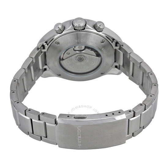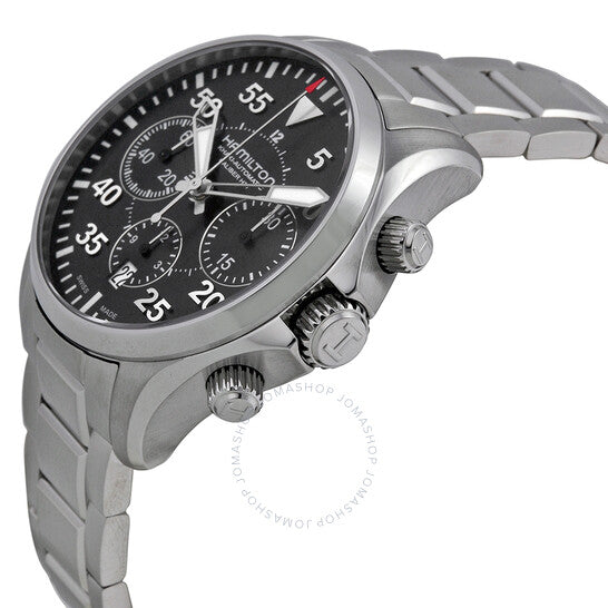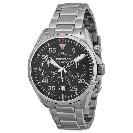 علبة فضية اللون من الفولاذ المقاوم للصدأ مع سوار فضي اللون من الفولاذ المقاوم للصدأ. إطار ثابت فضي اللون من الفولاذ المقاوم للصدأ. ميناء أسود بعقارب مضيئة وعلامات ساعات عربية. علامات دقائق حول الحافة الخارجية. نوع الميناء: تناظري. عقارب وعلامات مضيئة. عرض التاريخ عند موضع الساعة السادسة. كرونوغراف - ثلاثة أقراص فرعية تعرض: 60 ثانية، 30 دقيقة، و12 ساعة. حركة هاميلتون كاليبر H-31 أوتوماتيكية، مبنية على ETA 7753، تحتوي على 27 جوهرة، تنبض بمعدل 28800 ذبذبة في الساعة، ولديها احتياطي طاقة لمدة 60 ساعة تقريبًا. زجاج ياقوت مقاوم للخدش. غطاء خلفي شفاف. شكل دائري، حجم العلبة: 42 مم، سمك العلبة: 16 مم. عرض السوار: 20 مم. مشبك قابل للطي. مقاومة للماء حتى عمق 200 متر / 660 قدمًا. الوظائف: كرونوغراف، تاريخ، ساعة، دقيقة، ثانية. سلسلة كاكي. ساعة بايلوت بتصميم أنيق. علامة الساعة: صناعة سويسرية. هاميلتون كاكي أفييشن بايلوت أوتوماتيكية كرونوغراف للرجال، طراز H64666135.