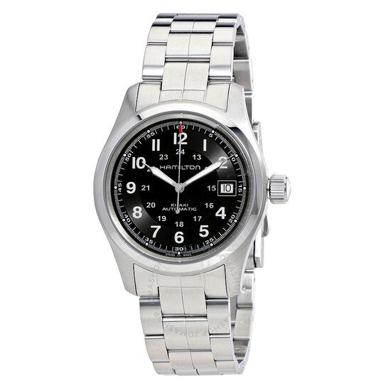 علبة من الفولاذ المقاوم للصدأ مع سوار من الفولاذ المقاوم للصدأ. إطار ثابت من الفولاذ المقاوم للصدأ. ميناء أسود مع عقارب فضية مضيئة على شكل سيف وعلامات ساعات رقمية عربية. علامات ٢٤ ساعة (توقيت غرينتش) حول حلقة داخلية. علامات دقائق حول الحافة الخارجية. نوع الميناء: تناظري. عقارب وعلامات مضيئة. عرض التاريخ عند موضع الساعة الثالثة. حركة أوتوماتيكية هاميلتون كاليبر H-10، مبنية على ETA C07.111، تحتوي على ٢٥ جوهرة، تنبض بمعدل ٢١٦٠٠ ذبذبة في الساعة، ولديها احتياطي طاقة يبلغ حوالي ٨٠ ساعة. كريستال ياقوت مقاوم للخدش. تاج قابل للسحب/الدفع. غطاء خلفي شفاف. شكل دائري. حجم العلبة: ٣٨ مم. سمك العلبة: ١٠ مم. عرض السوار: ٢٠ مم. مشبك قابل للطي بزر ضغط للتحرير. مقاومة للماء حتى عمق ١٠٠ متر / ٣٣٠ قدمًا. الوظائف: التاريخ، الساعة، الدقيقة، الثانية. طراز ساعة رسمية. ملصق الساعة: صناعة سويسرية. ساعة هاميلتون كاكي فيلد أوتوماتيكية للرجال بمينا أسود H70455133.