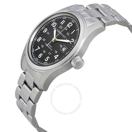 علبة من الفولاذ المقاوم للصدأ المصقول مع سوار من الفولاذ المقاوم للصدأ المصقول. إطار ثابت من الفولاذ المقاوم للصدأ. ميناء أسود بعقارب مضيئة وعلامات ساعات رقمية عربية. علامات ٢٤ ساعة. علامات دقائق حول الحافة الخارجية. نوع الميناء: تناظري. عقارب وعلامات مضيئة. عرض التاريخ عند موضع الساعة الثالثة. حركة أوتوماتيكية من هاميلتون، عيار H-10، مبنية على ETA C07.111، تحتوي على ٢٥ جوهرة، تنبض بتردد ٢١٦٠٠ ذبذبة في الساعة، ولديها احتياطي طاقة يقارب ٨٠ ساعة. زجاج من الياقوت المقاوم للخدش. تاج قابل للسحب/الدفع. ظهر هيكلي. شكل دائري. حجم العلبة: ٤٢ مم. عرض السوار: ٢٢ مم. طول السوار: ٨.٥ بوصة. مشبك قابل للطي. مقاومة للماء حتى عمق ١٠٠ متر / ٣٣٠ قدمًا. الوظائف: التاريخ، الساعة، الدقائق، الثواني. تصميم ساعة كاجوال. علامة الساعة: صناعة سويسرية. رقم الصنف: H70515137. ساعة هاميلتون كاكي فيلد الأوتوماتيكية للرجال H70515137.