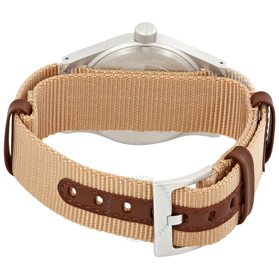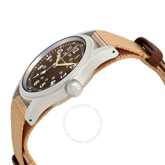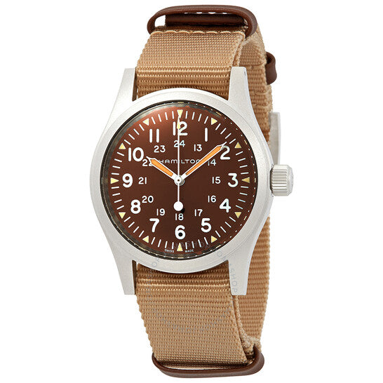 علبة من الفولاذ المقاوم للصدأ فضية اللون مع سوار ناتو بيج. إطار ثابت من الفولاذ المقاوم للصدأ فضي اللون. ميناء بني مع عقارب فضية مضيئة وعلامات ساعات عربية. علامات ٢٤ ساعة وعلامات دقائق حول الحافة الخارجية. نوع الميناء: تناظري. عقارب وعلامات مضيئة. آلية حركة يدوية من عيار ETA 2801-2. زجاج ياقوتي مقاوم للخدش. تاج قابل للسحب/الدفع. غطاء خلفي صلب. شكل دائري، مقاس العلبة: ٣٨ مم، سمكها: ٩.٥ مم. عرض السوار: ٢٠ مم. مشبك تانغ. مقاومة للماء حتى عمق ٥٠ مترًا / ١٦٥ قدمًا. الوظائف: الساعات، الدقائق، الثواني. طراز عسكري. علامة الساعة: صناعة سويسرية. ساعة هاميلتون كاكي فيلد الميكانيكية للرجال بمينا بني H69429901.