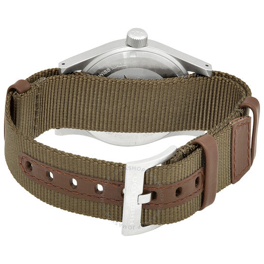 علبة من الفولاذ المقاوم للصدأ غير اللامع مع سوار من القماش الأخضر. إطار ثابت من الفولاذ المقاوم للصدأ. ميناء أبيض بعقارب سوداء مضيئة وعلامات ساعات رقمية عربية. علامات ٢٤ ساعة. علامات دقائق حول الحافة الخارجية. نوع الميناء: تناظري. عقارب وعلامات مضيئة. آلية حركة هاميلتون كاليبر H-50 يدوية التعبئة، مبنية على ETA 2801-2، تحتوي على ١٧ جوهرة، تنبض بتردد ٢١٦٠٠ ذبذبة في الساعة، ولديها احتياطي طاقة يقارب ٨٠ ساعة. زجاج من الياقوت المقاوم للخدش. تاج قابل للسحب/الدفع. غطاء خلفي صلب. شكل دائري. حجم العلبة: ٣٨ مم. سمكها: ٩.٥ مم. عرض السوار: ٢٠ مم. مشبك تانغ. مقاومة للماء حتى عمق ٥٠ مترًا / ١٦٥ قدمًا. الوظائف: الساعات، الدقائق، الثواني. تصميم كاجوال. علامة الساعة: صناعة سويسرية. ساعة هاميلتون كاكي فيلد ميكانيكية للرجال بمينا بيضاء H69439411.