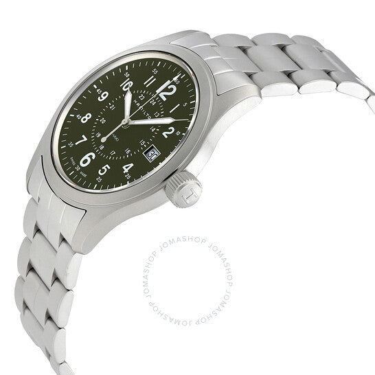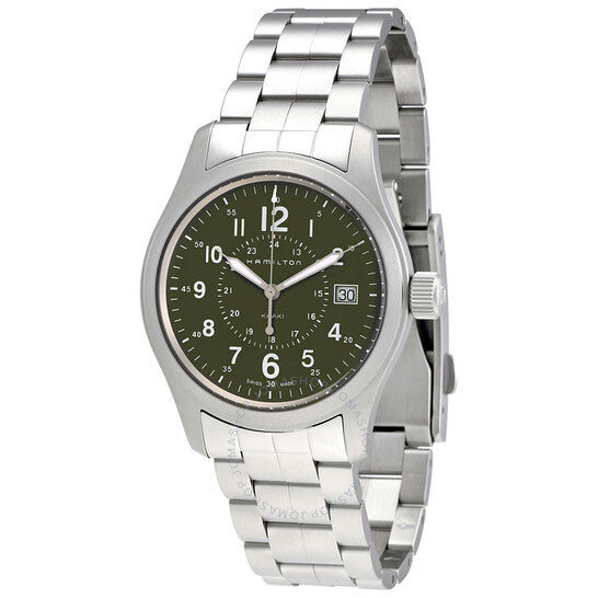 علبة من الفولاذ المقاوم للصدأ مع سوار من الفولاذ المقاوم للصدأ. إطار ثابت من الفولاذ المقاوم للصدأ. ميناء أخضر زيتوني مع عقارب فضية مضيئة وعلامات ساعات رقمية عربية. علامات ٢٤ ساعة. علامات دقائق حول الحافة الخارجية. نوع الميناء: تناظري. عقارب وعلامات مضيئة. عرض التاريخ عند موضع الساعة ٣. حركة كوارتز ETA عيار F06.111. زجاج ياقوت مقاوم للخدش. تاج لولبي. غطاء خلفي صلب. شكل دائري، مقاس العلبة: ٣٨ مم، سمكها: ١٠ مم. عرض السوار: ٢٠ مم. مشبك قابل للطي بزر ضغط. مقاومة للماء حتى عمق ١٠٠ متر / ٣٣٠ قدمًا. الوظائف: التاريخ، الساعة، الدقيقة، الثانية. معلومات إضافية: مناسبة للغطس والسباحة، ولكن ليس للغوص. تصميم كاجوال. علامة الساعة: صناعة سويسرية. ساعة هاميلتون كاكي فيلد للرجال بمينا أخضر زيتوني H68201163.