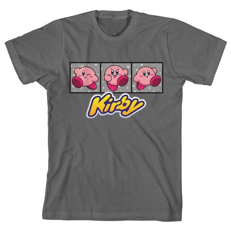 - تيشيرت برسومات جرافيكية: يغمز كيربي ويركل ويمشي بألواح رمادية مزينة بنجوم بيضاء، بينما يظهر اسم الشخصية أسفله بأحرف صفراء. سيحب عشاق ألعاب الفيديو كيربي هذا التصميم الممتع.