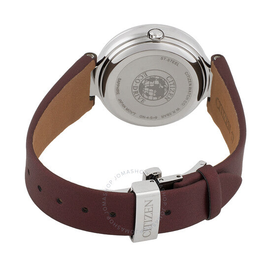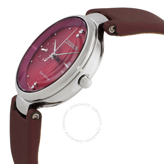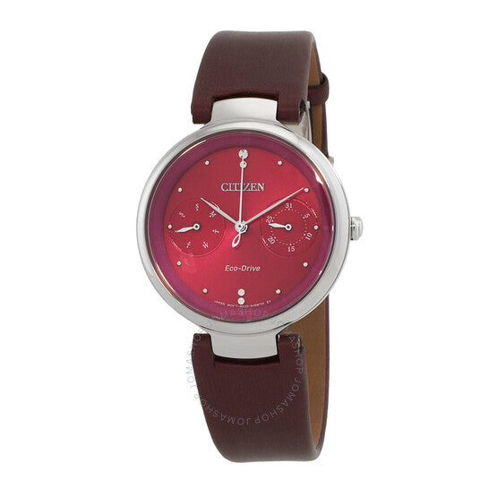 علبة من الفولاذ المقاوم للصدأ فضية اللون مع سوار من الجلد الصناعي الأحمر. إطار ثابت من الفولاذ المقاوم للصدأ فضي اللون. ميناء أحمر بعقارب فضية اللون وعلامات ساعات. نوع الميناء: تناظري. ميناءان فرعيان يعرضان التاريخ واليوم. حركة سيتيزن كاليبر إيكو-درايف 8635 إيكو-درايف. زجاج ياقوت مقاوم للخدش. تاج قابل للسحب/الدفع. غطاء خلفي صلب. شكل دائري، مقاس العلبة: 35.5 مم. مشبك بإبزيم. مقاومة للماء حتى عمق 50 مترًا / 165 قدمًا. الوظائف: التاريخ، اليوم، الساعة، الدقيقة، الثانية، تعمل بالطاقة الشمسية. سلسلة سيتيزن L. طراز ساعة رياضية. علامة الساعة: Japan Movt. ساعة سيتيزن L إيكو-درايف نسائية بمينا أحمر FD1100-10X.