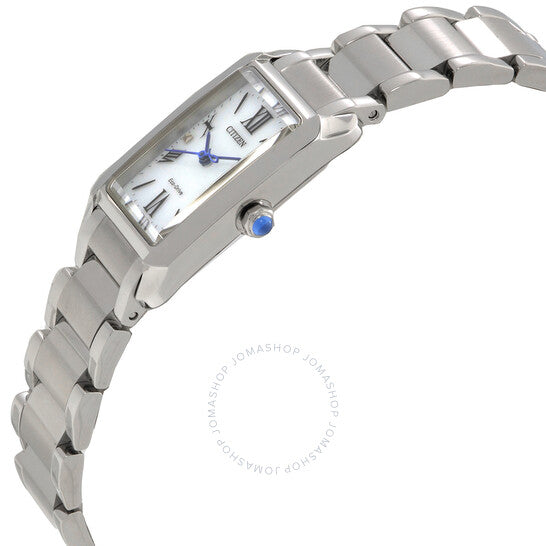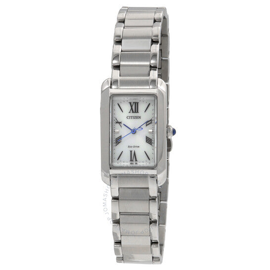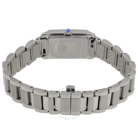 علبة وسوار من الفولاذ المقاوم للصدأ فضي اللون. إطار ثابت من الفولاذ المقاوم للصدأ فضي اللون. ميناء أبيض بعقارب زرقاء وعلامات ساعات بأرقام رومانية. علامات دقائق حول الحافة الخارجية. نوع الميناء: تناظري. حركة سيتيزن كاليبر إيكو-درايف B035 إيكو-درايف. زجاج من الياقوت المقاوم للخدش. تاج قابل للسحب/الدفع. غطاء خلفي صلب. هيكل مستطيل الشكل، أبعاده: 32.4 × 19.5 مم، سُمكه: 7.5 مم. إبزيم قابل للطي بزر ضغط. مقاومة للماء حتى عمق 50 مترًا / 165 قدمًا. الوظائف: الساعات، الدقائق، الثواني، تعمل بالطاقة الشمسية. سلسلة سيتيزن L. تصميم كاجوال. علامة الساعة: Japan Movt. ساعة سيتيزن L إيكو-درايف نسائية بمينا أبيض EW5620-55A.