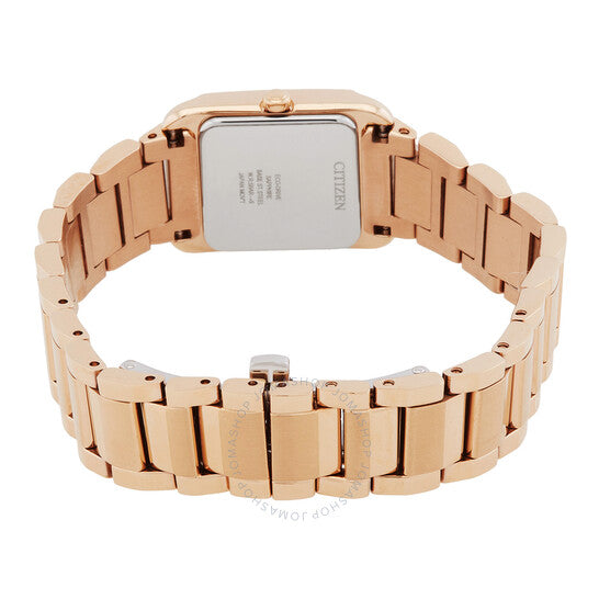 علبة وسوار من الفولاذ المقاوم للصدأ بلون الذهب الوردي. إطار ثابت من الفولاذ المقاوم للصدأ بلون الذهب الوردي. ميناء من عرق اللؤلؤ مع عقارب زرقاء ومؤشرات ساعات بأرقام عربية. نوع الميناء: تناظري. حركة Citizen Caliber B035 eco-drive. زجاج من الياقوت المقاوم للخدش. تاج قابل للسحب/الدفع. غطاء خلفي صلب. شكل العلبة مستطيل، مقاسها: 21.5 مم، سمكها: 7.5 مم. مشبك فراشة. مقاومة للماء حتى عمق 50 مترًا / 165 قدمًا. الوظائف: الساعات، الدقائق، الثواني. = سلسلة. طراز ساعة رسمية. ملصق الساعة: Japan Movt. Citizen = ساعة نسائية EW5603-89Y.