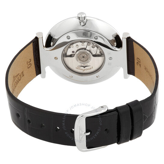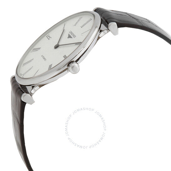 علبة فضية اللون من الفولاذ المقاوم للصدأ مع سوار جلدي أسود. إطار ثابت من الفولاذ المقاوم للصدأ فضي اللون. ميناء أبيض بعقارب سوداء وعلامات ساعات بأرقام رومانية. نوع الميناء: تناظري. حركة لونجين كاليبر L591 أوتوماتيكية، مبنية على ETA A20.L01، تحتوي على 22 جوهرة، تنبض بمعدل 28800 ذبذبة في الساعة، ولديها احتياطي طاقة لمدة 40 ساعة تقريبًا. زجاج ياقوتي مقاوم للخدش. غطاء خلفي شفاف. شكل العلبة دائري، مقاسها 38 مم. مشبك بإبزيم. مقاومة للماء حتى عمق 30 مترًا / 100 قدم. الوظائف: الساعات، الدقائق. معلومات إضافية: العلبة الأصلية، بطاقة الضمان الدولية، دليل الاستخدام (ملحقات كاملة). سلسلة لا جراند. تصميم ساعة فاخرة. ملصق الساعة: صناعة سويسرية. ساعة لونجين لا جراند أوتوماتيكية للرجال بمينا أبيض L4.918.4.11.2.