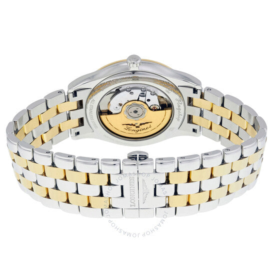 علبة من الفولاذ المقاوم للصدأ مع سوار من الفولاذ المقاوم للصدأ ثنائي اللون (فضي وذهبي أصفر مطلي بتقنية PVD). إطار ثابت من الذهب الأصفر مطلي بتقنية PVD. ميناء أبيض بعقارب ذهبية صفراء وعلامات ساعات من الماس. نوع الميناء: تناظري. عرض التاريخ عند موضع الساعة 3. آلية حركة أوتوماتيكية. زجاج ياقوت مقاوم للخدش. تاج قابل للسحب/الدفع. غطاء خلفي هيكلي. حجم العلبة: 38.5 مم. شكل دائري. مشبك قابل للطي. مقاومة للماء حتى عمق 30 مترًا / 100 قدم. الوظائف: التاريخ، الساعة، الدقيقة، الثانية. تصميم ساعة فاخرة. علامة الساعة: صناعة سويسرية. ساعة لونجين لا غراند كلاسيك أوتوماتيكية للرجال L4.874.3.27.7.