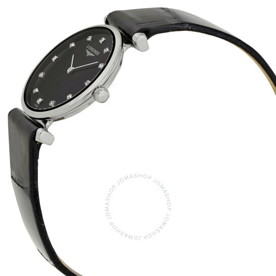 علبة من الفولاذ المقاوم للصدأ مع سوار أسود من جلد التمساح. إطار ثابت من الفولاذ المقاوم للصدأ. ميناء أسود بعقارب فضية اللون وعلامات ساعات من الألماس. نوع الميناء: تناظري. حركة كوارتز. زجاج ياقوت مقاوم للخدش. تاج قابل للسحب/الدفع. غطاء خلفي صلب. حجم العلبة: ٢٤ مم. سُمكها: ٥ مم. شكلها دائري. عرض السوار: ١٤ مم. مشبك تانغ. مقاومة للماء حتى عمق ٣٠ مترًا / ١٠٠ قدم. الوظائف: الساعات، الدقائق. طراز ساعة فاخرة. علامة الساعة: صناعة سويسرية. إصدارات المنتج: L4 209 4 58 2، L4-209-4-58-2، L4/209/4/58/2، L42094582. ساعة لونجين لا غراند كلاسيك النسائية بمينا أسود ومرصعة بالألماس L4.209.4.58.2.