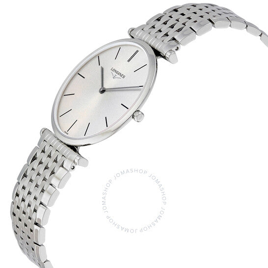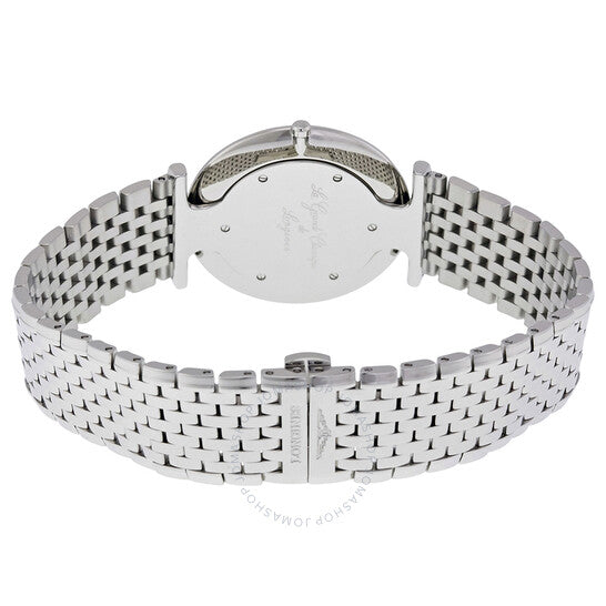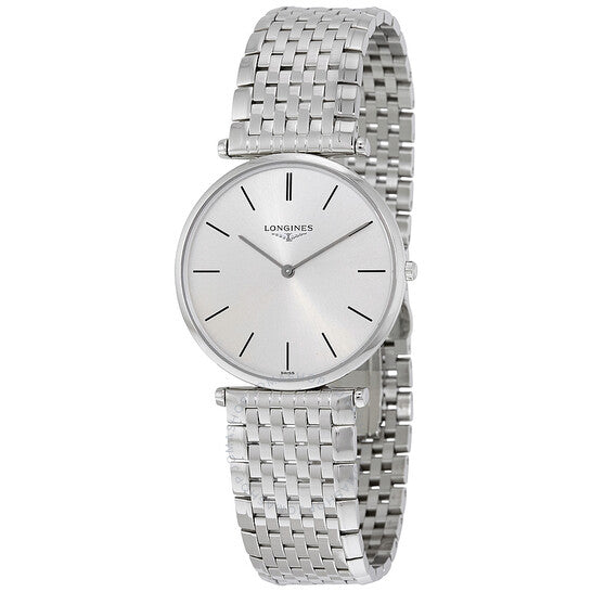 علبة من الفولاذ المقاوم للصدأ مع سوار من الفولاذ المقاوم للصدأ. إطار ثابت من الفولاذ المقاوم للصدأ. ميناء فضي اللون مع عقارب ومؤشرات ساعات فضية اللون. نوع الميناء: تناظري. حركة كوارتز لونجين كاليبر L420. زجاج ياقوتي مقاوم للخدش. تاج قابل للسحب/الدفع. غطاء خلفي صلب. شكل دائري. حجم العلبة: 36 مم. عرض السوار: 20 مم. مشبك قابل للطي بزر ضغط. مقاومة للماء حتى عمق 30 مترًا / 100 قدم. الوظائف: الساعات، الدقائق. سلسلة لا غراند كلاسيك. تصميم ساعة فاخرة. علامة الساعة: صناعة سويسرية. ساعة لونجين لا غراند كلاسيك النسائية L4.755.4.72.6.