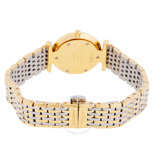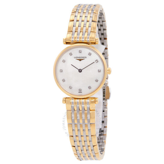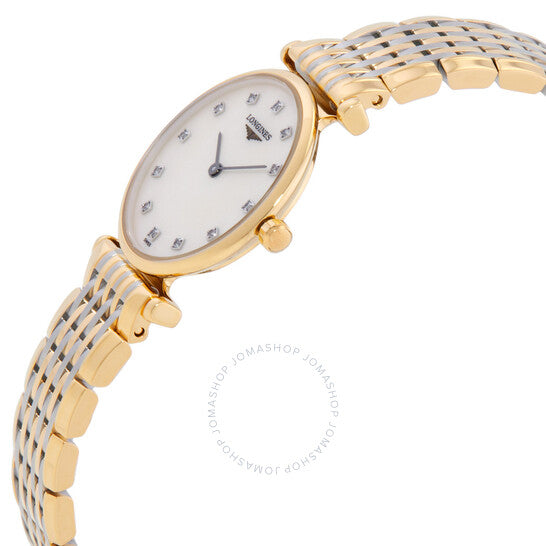 علبة من الفولاذ المقاوم للصدأ مطلية بالذهب الأصفر بتقنية PVD، مع سوار من الفولاذ المقاوم للصدأ ثنائي اللون (فضي وذهبي أصفر بتقنية PVD). إطار ثابت من الفولاذ المقاوم للصدأ مطلي بالذهب الأصفر بتقنية PVD. ميناء أبيض من عرق اللؤلؤ مع عقارب سوداء و12 علامة ألماس من Top Wesselton VS-SI، بوزن إجمالي 0.048 قيراط. نوع الميناء: تناظري. حركة كوارتز من لونجين كاليبر L209. زجاج من الياقوت المقاوم للخدش. تاج قابل للسحب/الدفع. غطاء خلفي صلب. شكل دائري، مقاس العلبة: 24 مم، سمكها: 4.3 مم. عرض السوار: 13 مم. مشبك قابل للطي مع مفتاح أمان. مقاومة للماء حتى عمق 30 مترًا / 100 قدم. الوظائف: الساعات، الدقائق. سلسلة لا غراند كلاسيك. تصميم كاجوال. علامة الساعة: صناعة سويسرية. ساعة لونجين لا غراند كلاسيك كوارتز نسائية مرصعة بالألماس L4.209.2.87.D.