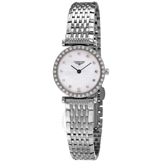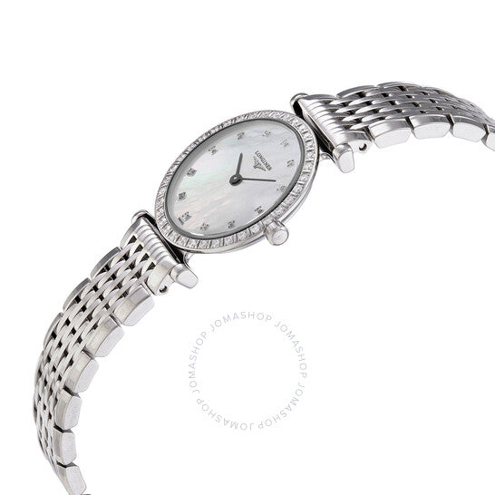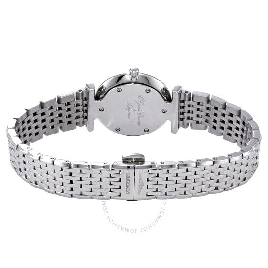 علبة من الفولاذ المقاوم للصدأ مع سوار من الفولاذ المقاوم للصدأ. إطار ثابت من الفولاذ المقاوم للصدأ مرصع بالألماس. ميناء أبيض من عرق اللؤلؤ مع عقارب سوداء وعلامات ساعات من الألماس. نوع الميناء: تناظري. حركة كوارتز عيار L209. زجاج ياقوت مقاوم للخدش. تاج قابل للسحب/الدفع. غطاء خلفي صلب. شكل دائري. حجم العلبة: 24 مم. سمكها: 5 مم. عرض السوار: 13 مم. مشبك طي مخفي. مقاومة للماء حتى عمق 30 مترًا / 99 قدمًا. الوظائف: الساعات، الدقائق. سلسلة لا غراند كلاسيك. طراز ساعة رسمية. علامة الساعة: صناعة سويسرية. ساعة لونجين لا غراند كلاسيك كوارتز نسائية مرصعة بالألماس L4.341.0.80.6.