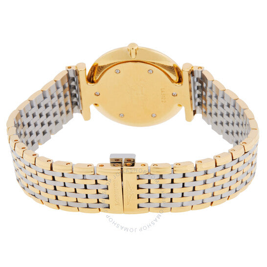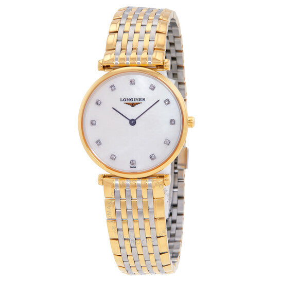 علبة من الفولاذ المقاوم للصدأ مطلية بالذهب الأصفر بتقنية PVD، مع سوار من الفولاذ المقاوم للصدأ ثنائي اللون (فضي وذهبي أصفر بتقنية PVD). إطار ثابت من الفولاذ المقاوم للصدأ مطلي بالذهب الأصفر بتقنية PVD. ميناء أبيض من عرق اللؤلؤ مع عقارب سوداء و12 علامة ألماس من Top Wesselton VS-SI، بوزن إجمالي 0.081 قيراط. نوع الميناء: تناظري. حركة كوارتز من لونجين كاليبر L420. زجاج من الياقوت المقاوم للخدش. تاج قابل للسحب/الدفع. غطاء خلفي صلب. شكل دائري، مقاس العلبة: 29 مم، سمكها: 4.5 مم. عرض السوار: 16 مم. مشبك قابل للطي مع مفتاح أمان. مقاومة للماء حتى عمق 30 مترًا / 100 قدم. الوظائف: الساعات، الدقائق. سلسلة لا غراند كلاسيك. تصميم كاجوال. علامة الساعة: صناعة سويسرية. ساعة لونجين لا غراند كلاسيك كوارتز نسائية مرصعة بالألماس L4.512.2.87.D.