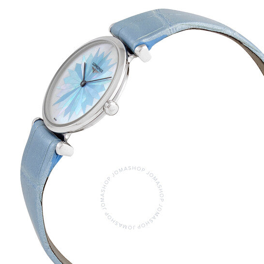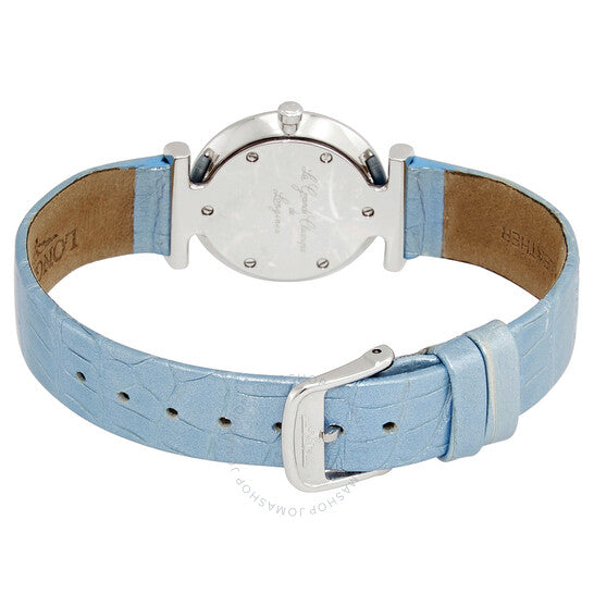علبة من الفولاذ المقاوم للصدأ مع سوار جلدي أزرق. إطار ثابت من الفولاذ المقاوم للصدأ. ميناء أبيض من عرق اللؤلؤ مع عقارب سوداء. بدون مؤشرات. نوع الميناء: تناظري. حركة كوارتز من لونجين عيار L209. زجاج ياقوت مقاوم للخدش. تاج قابل للسحب/الدفع. غطاء خلفي صلب. شكل دائري. حجم العلبة: 24 مم. سمكها: 5 مم. عرض السوار: 12 مم. مشبك تانغ. مقاومة للماء حتى عمق 30 مترًا / 100 قدم. الوظائف: الساعات، الدقائق. سلسلة لا غراند كلاسيك. تصميم أنيق. علامة الساعة: صناعة سويسرية. ساعة لونجين لا غراند كلاسيك كوارتز نسائية L4.209.4.03.2.