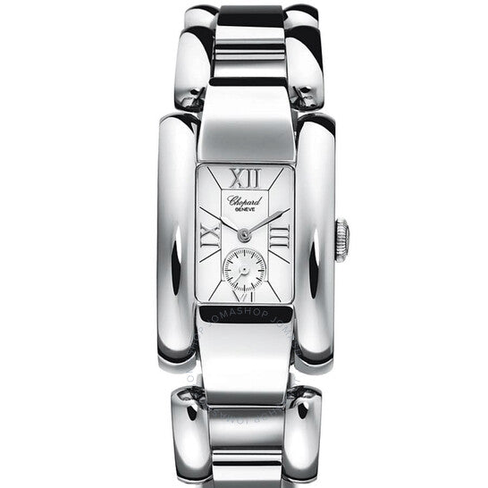 علبة فضية اللون من الفولاذ المقاوم للصدأ مع سوار فضي اللون. إطار ثابت فضي اللون من الفولاذ المقاوم للصدأ. ميناء أبيض بعقارب فضية اللون على شكل سيف وعلامات ساعات بأرقام رومانية. نوع الميناء: تناظري. ميناء فرعي واحد يعرض الثواني الصغيرة. حركة كوارتز. زجاج ياقوت مقاوم للخدش. تاج لولبي. شكل فريد للعلبة، مقاسها: 34.5 مم × 23 مم. مشبك تانغ. مقاومة للماء حتى عمق 30 مترًا / 100 قدم. الوظائف: الساعات، الدقائق، الثواني الصغيرة. معلومات إضافية: ميناء فرعي للثواني الصغيرة. سلسلة لا سترادا. تصميم ساعة فاخر. علامة الساعة: صناعة سويسرية. إصدارات المنتج: 41/8380-WH. ساعة شوبارد لا سترادا النسائية الفولاذية البيضاء 41/8380.