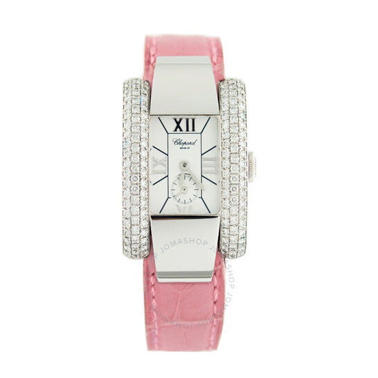 علبة من الذهب الأبيض عيار 18 قيراطًا، مع سوار من جلد التمساح الوردي. إطار ثابت مرصع بالألماس. ميناء أبيض بعقارب فضية اللون وعلامات ساعات. نوع الميناء: تناظري. ميناء فرعي واحد يعرض الثواني الصغيرة. حركة كوارتز. كريستال ياقوتي مقاوم للخدش. غطاء خلفي صلب. شكل فريد للعلبة، مقاسها: 23.5 × 44.5 مم. مقاومة للماء حتى عمق 30 مترًا / 100 قدم. وظائفها: الساعات، الدقائق، الثواني. سلسلة لا سترادا. تصميم ساعة فاخرة. علامة الساعة: صناعة سويسرية. ساعة شوبارد لا سترادا نسائية بمينا أبيض ومرصعة بالألماس، رقم 416823.