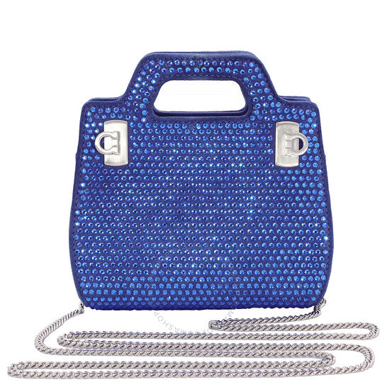 حقيبة يد نسائية من فيراغامو. رمز المنتج: 214469 762650. الرمز الشريطي: 8056283169714. اللون: أزرق. المقاس: الارتفاع 7.0 بوصة × الطول 7.0 بوصة × العرض 2.3 بوصة. حقيبة واندا ميني من فيراغامو نسائية زرقاء مرصعة بالكريستال. تتميز حقيبة واندا بخطوط هندسية وأجزاء ناعمة من جلد العجل، مما يُبرز تصميمها البسيط بمقبض مدمج وإبزيمات غانشيني ساتان على الجانبين. يمكن حملها كحقيبة يد أو على الكتف بحزام قابل للفصل. صنع في إيطاليا.