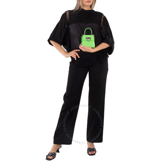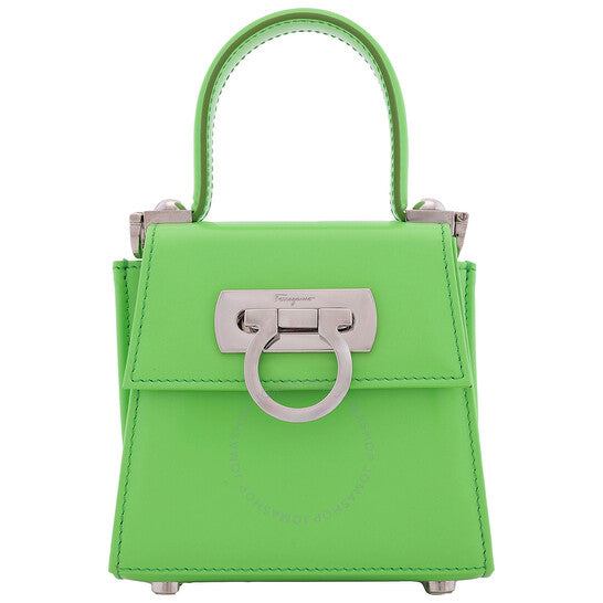 حقيبة فيراغامو النسائية الصغيرة. رمز المنتج: 213972 763067. الرمز الشريطي: 8056283175432. اللون: أخضر. المقاس: الارتفاع 12.0 سم / 4.7 بوصة × الطول 12.0 سم / 4.7 بوصة. حقيبة فيراغامو النسائية الخضراء "مايكرو أيقونيك" بمقبض علوي. مصنوعة من جلد لامع، تتميز هذه الحقيبة الصغيرة بتصميم أنيق وألواح هندسية مصقولة. يكملها قفل غانشيني ذهبي، ومقبض متين، وحزام كتف قابل للفصل. الغطاء الأمامي مُثبت بمشبك غانشيني، وتحتوي الحقيبة على جيبين رئيسيين وقواعد معدنية لمزيد من الحماية. صنع في إيطاليا.