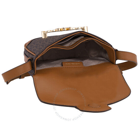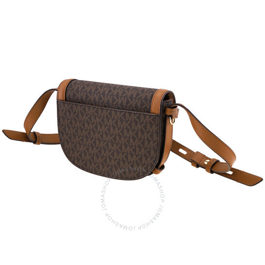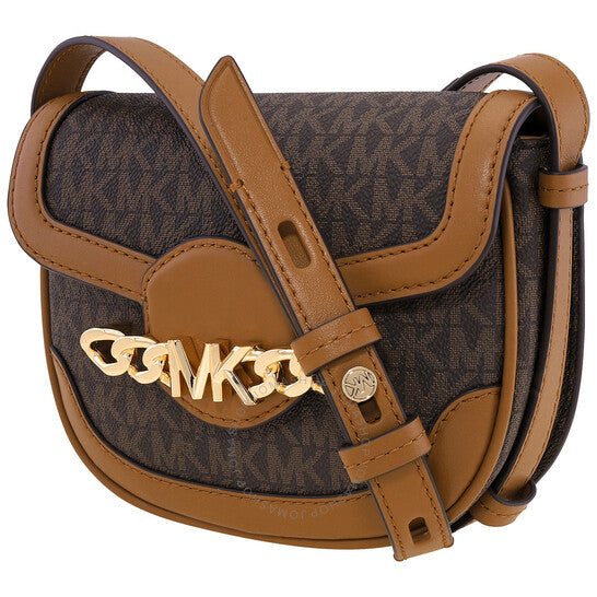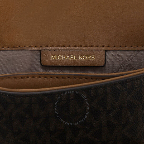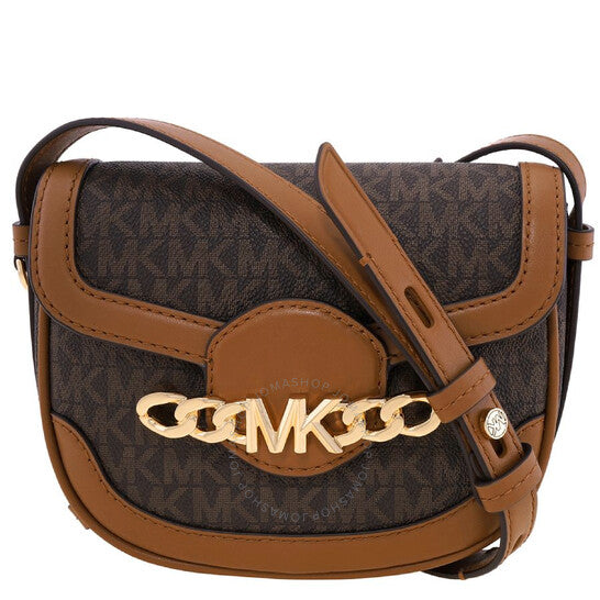 حقيبة كروس بودي من مايكل كورس. رمز المنتج: 32F1G2HC1B-252. الرمز الشريطي: 194900740231. اللون: بني/بلوطي. المقاس: 7.75 بوصة عرض × 5.5 بوصة ارتفاع × 2.75 بوصة عمق. حقيبة كروس بودي هالي النسائية من مايكل كورس، صغيرة جدًا، مزينة بشعار العلامة التجارية. حقيبة كروس بودي هالي مصنوعة من قماش الكانفاس المطبوع بشعار العلامة التجارية، مع أجزاء معدنية ذهبية اللون وحواف جلدية ناعمة. تتميز بجيب خلفي خارجي، وقسم رئيسي مع جيب أمامي داخلي، وثلاث فتحات داخلية للبطاقات، وبطانة من البوليستر، وكباس للإغلاق، ومزينة بسلسلة مزخرفة وشعار مايكل كورس على الجهة الأمامية. الخامة: قماش، جلد.