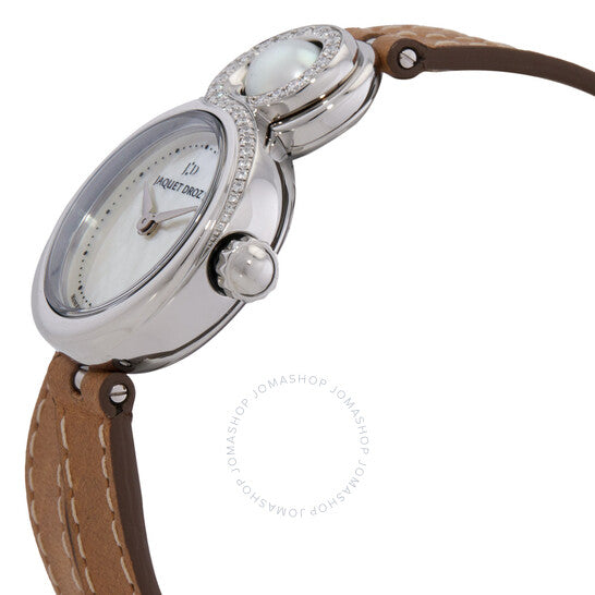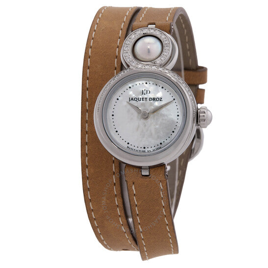 علبة من الفولاذ المقاوم للصدأ مرصعة بالألماس بلون فضي مع سوار جلدي. إطار ثابت من الفولاذ المقاوم للصدأ بلون فضي. ميناء من عرق اللؤلؤ مع عقارب ومؤشرات ساعات فضية اللون. نوع الميناء: تناظري. حركة أوتوماتيكية. زجاج من الياقوت المقاوم للخدش. تاج قابل للسحب/الدفع. غطاء خلفي شفاف. شكل العلبة دائري، مقاسها: ٢٥ مم. مشبك بإبزيم. مقاومة للماء حتى عمق ٣٠ مترًا / ١٠٠ قدم. الوظائف: الساعات، الدقائق. سلسلة ليدي ٨ بيتيت. ساعة كاجوال أنيقة. ساعة جاكيه درو ليدي ٨ بيتيت أوتوماتيكية نسائية J014600373.