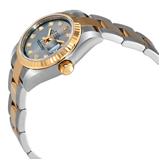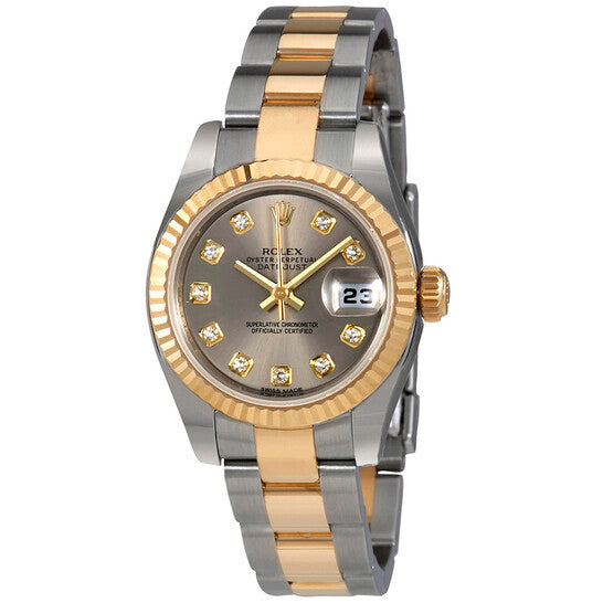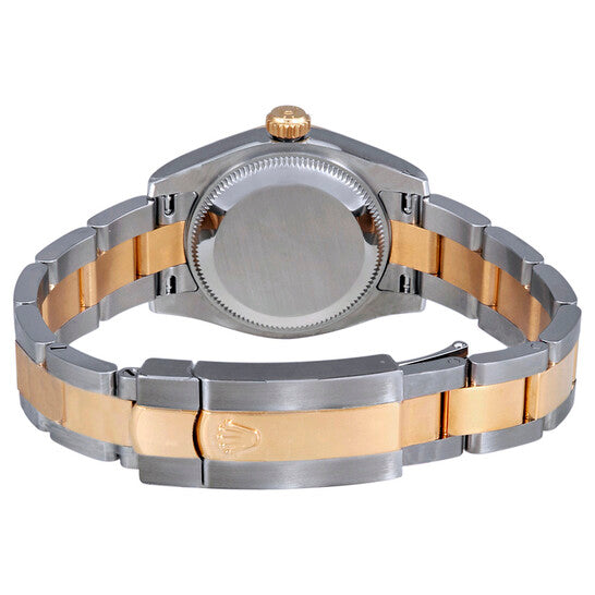 علبة من الفولاذ المقاوم للصدأ مع سوار رولكس أويستر من الفولاذ المقاوم للصدأ بوصلات مركزية من الذهب الأصفر عيار 18 قيراطًا. إطار ثابت مُخدّد من الذهب الأصفر عيار 18 قيراطًا. ميناء من الروديوم بعقارب ذهبية اللون وعلامات ساعات مضيئة على شكل عصا. علامات دقائق حول الحافة الخارجية. نوع الميناء: تناظري. عقارب وعلامات ميناء مضيئة. عرض التاريخ عند موضع الساعة 3. حركة رولكس أوتوماتيكية عيار 2235 مع احتياطي طاقة لمدة 48 ساعة. زجاج ياقوت مقاوم للخدش. تاج لولبي. غطاء خلفي صلب. حجم العلبة: 26 مم. شكل دائري. مشبك قابل للطي مخفي. مقاومة للماء حتى عمق 100 متر / 330 قدمًا. الوظائف: التاريخ، الساعات، الدقائق، الثواني، الكرونومتر. طراز ساعة فاخرة. علامة الساعة: صناعة سويسرية. ساعة رولكس ليدي ديت جست أوتوماتيكية بمينا ألماس من الروديوم، رقم 179173RDO.