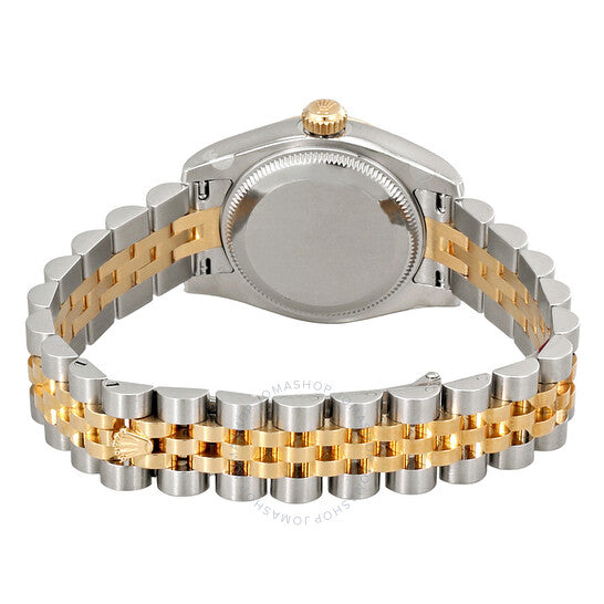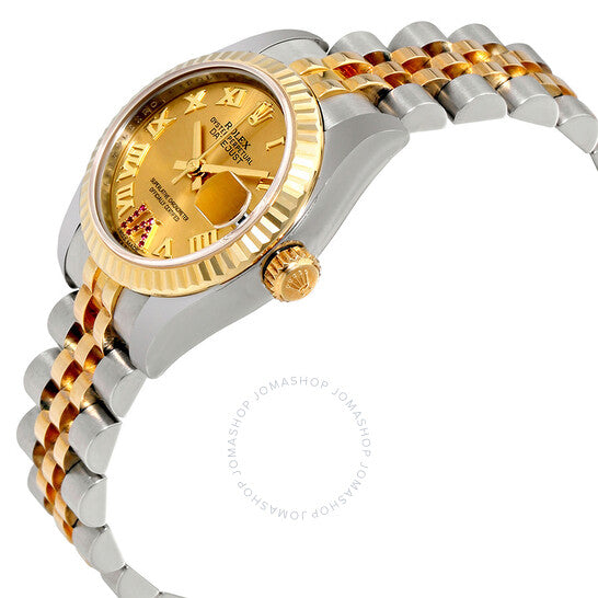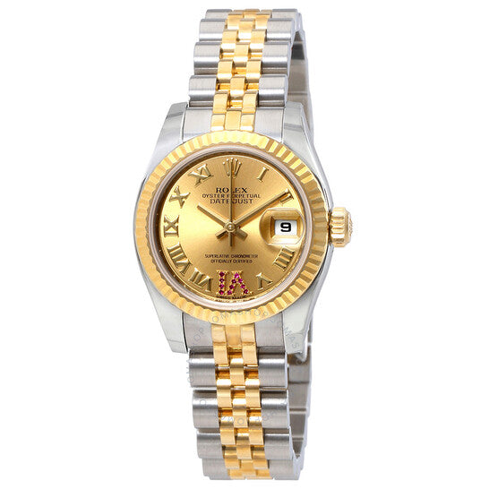 علبة من الفولاذ المقاوم للصدأ مع سوار رولكس جوبيلي من الفولاذ المقاوم للصدأ بوصلات مركزية من الذهب الأصفر عيار ١٨ قيراطًا. إطار ثابت مُخدّد من الذهب الأصفر عيار ١٨ قيراطًا. ميناء بلون الشمبانيا مع عقارب ذهبية صفراء وعلامات ساعات بأرقام رومانية. يظهر رقم روماني مرصع بالياقوت عند موضع الساعة ٦. نوع الميناء: تناظري. عرض التاريخ عند موضع الساعة ٣. حركة أوتوماتيكية من رولكس كاليبر ٢٢٣٥ مع احتياطي طاقة لمدة ٤٨ ساعة. زجاج ياقوت مقاوم للخدش. تاج لولبي. غطاء خلفي صلب. حجم العلبة: ٢٦ مم. شكل دائري. مشبك تاج مخفي. مقاومة للماء حتى عمق ١٠٠ متر / ٣٣٠ قدمًا. الوظائف: التاريخ، الساعة، الدقيقة، الثانية، الكرونومتر. طراز ساعة فاخرة. علامة الساعة: صناعة سويسرية. ساعة رولكس ليدي ديت جست أوتوماتيكية بمينا شمبانيا وياقوت أحمر رقم ١٧٩١٧٣CRRJ.