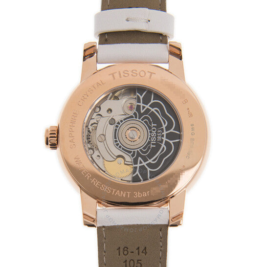 علبة من الفولاذ المقاوم للصدأ من الذهب الوردي بتقنية PVD 316L، مع سوار جلدي أبيض (صناعي). إطار ثابت من الذهب الوردي بتقنية PVD. ميناء أبيض مع عقارب ومؤشرات ساعات باللون الوردي. أرقام عربية تُشير إلى مواقع الساعات 3 و6 و9. نوع الميناء: تناظري. حركة أوتوماتيكية Powermatic 80.111، تحتوي على 23 جوهرة، تنبض بتردد 28800 ذبذبة في الساعة، ولديها احتياطي طاقة يصل إلى 80 ساعة تقريبًا. زجاج من الياقوت المقاوم للخدش. تاج قابل للسحب/الدفع. غطاء خلفي شفاف. شكل دائري. حجم العلبة: 35 مم. سمكها: 9.75 مم. عرض السوار: 17 مم. مشبك فراشة. مقاومة للماء حتى عمق 30 مترًا / 100 قدم. الوظائف: التاريخ، الساعة، الدقيقة، الثانية. معلومات إضافية: العلبة الأصلية، دليل الاستخدام (ملحقات كاملة). طراز ساعة فاخر. ملصق الساعة: صناعة سويسرية. ساعة تيسوت ليدي هارت أوتوماتيكية بمينا أبيض للسيدات T050.207.37.017.05.