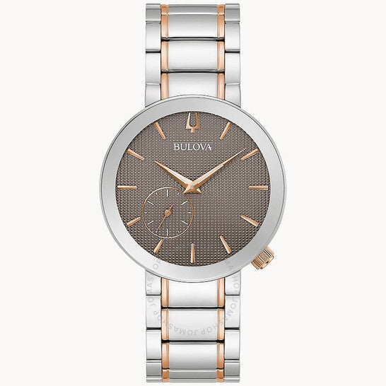علبة من الفولاذ المقاوم للصدأ فضية اللون مع سوار من الفولاذ المقاوم للصدأ ثنائي اللون (فضي وذهبي وردي). إطار ثابت من الفولاذ المقاوم للصدأ فضي اللون. ميناء رمادي مع عقارب وعلامات ساعات ذهبية وردية اللون. نوع الميناء: تناظري. عقارب مضيئة. موانئ فرعية للثواني الصغيرة. حركة كوارتز بولوفا كاليبر 1L45. زجاج معدني مقاوم للخدش. تاج قابل للسحب/الدفع. غطاء خلفي صلب. شكل دائري، مقاس العلبة: 35 مم. مشبك قابل للطي بزر ضغط. مقاومة للماء حتى عمق 30 مترًا / 100 قدم. الوظائف: الساعات، الدقائق، الثواني. سلسلة لاتين غرامي. تصميم كاجوال. ساعة بولوفا لاتين غرامي كوارتز نسائية 98L309.