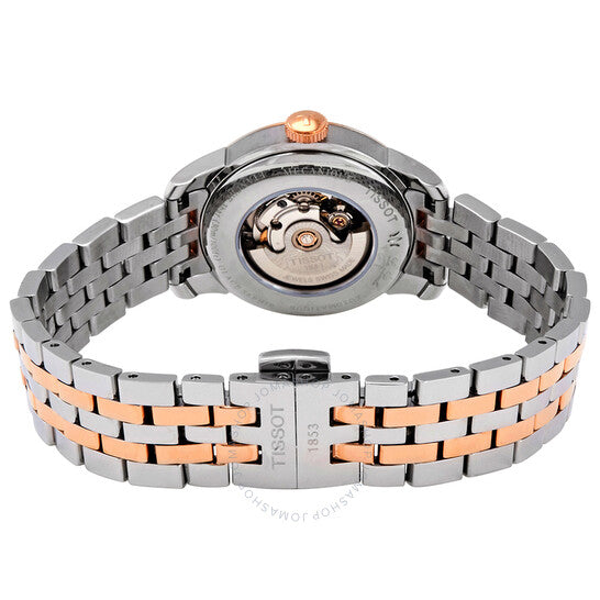 علبة من الفولاذ المقاوم للصدأ مطلية بالذهب الوردي بتقنية PVD، مع سوار من الفولاذ المقاوم للصدأ ثنائي اللون (فضي وذهبي وردي بتقنية PVD). إطار ثابت من الفولاذ المقاوم للصدأ مطلي بالذهب الوردي بتقنية PVD. ميناء من عرق اللؤلؤ مع عقارب على شكل أوراق شجر بلون الذهب الوردي وعلامات ساعات من الماس. علامات دقائق حول الحافة الخارجية. نوع الميناء: تناظري. عرض التاريخ عند موضع الساعة 3. حركة أوتوماتيكية ETA Caliber 2671، تحتوي على 25 جوهرة، تنبض بمعدل 28800 ذبذبة في الساعة، ولديها احتياطي طاقة لمدة 38 ساعة تقريبًا. زجاج من الياقوت المقاوم للخدش. تاج قابل للسحب/الدفع. غطاء خلفي شفاف. شكل العلبة دائري، حجم العلبة: 29 مم، سمك العلبة: 8.95 مم. عرض السوار: 14 مم. مشبك فراشة. مقاومة للماء حتى عمق 30 مترًا / 100 قدم. الوظائف: التاريخ، الساعة، الدقيقة، الثانية. سلسلة Le Locle. طراز ساعة رسمية. ملصق الساعة: صنع سويسري. ساعة تيسو لو لوكل أوتوماتيكية مرصعة بالألماس للسيدات T006.207.22.116.00.