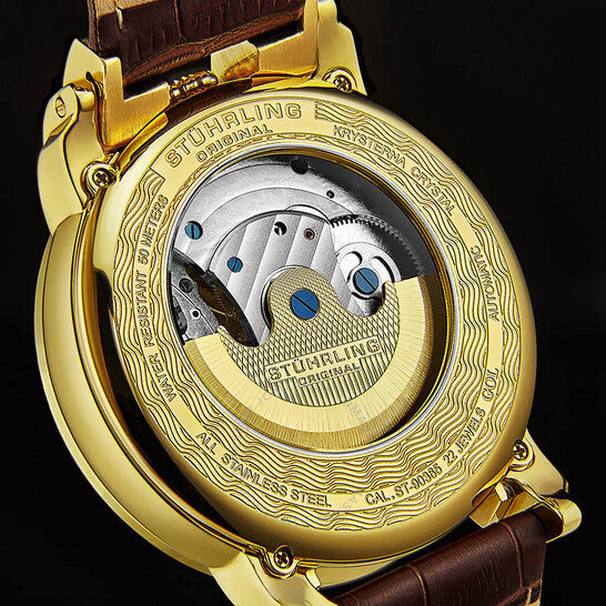 علبة من الفولاذ المقاوم للصدأ بلون الذهب الأصفر مع سوار جلدي بني. إطار ثابت بلون الذهب الأصفر. ميناء ذهبي (هيكلي مركزي) بعقارب زرقاء على شكل سيف وعلامات ساعات. نوع الميناء: تناظري. ميناءان فرعيان يعرضان: صباحًا/مساءً و١٢ ساعة (توقيت مزدوج). حركة أوتوماتيكية. زجاج معدني مقاوم للخدش. تاج قابل للسحب/الدفع. غطاء خلفي شفاف. شكل دائري. حجم العلبة: ٤٧ مم. سمكها: ١٣ مم. طول السوار: ٨.٧٥ بوصة. مشبك تانغ. مقاومة للماء حتى عمق ٥٠ مترًا / ١٦٥ قدمًا. الوظائف: ساعات، دقائق، مؤشر صباحًا/مساءً، توقيت مزدوج. سلسلة ليجاسي. طراز ساعة رسمية. ساعة ستاهرلنغ الأصلية ليجاسي أوتوماتيكية للرجال بمينا ذهبي M13514.