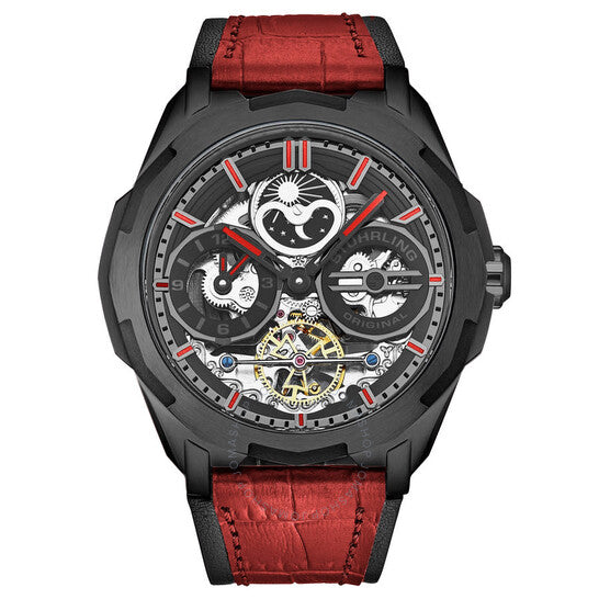 علبة سوداء مطلية بالأيون - تاج أسود مطلي بالأيون - ميناء أسود/معدني - سوار أحمر/أسود مع إبزيم أسود مطلي بالأيون. علبة سوداء من الفولاذ المقاوم للصدأ مع سوار جلدي أحمر. إطار ثابت من الفولاذ المقاوم للصدأ أسود. ميناء أحمر مع عقارب وعلامات ساعات سوداء. علامات دقائق حول الحافة الخارجية. نوع الميناء: تناظري. عقارب وعلامات مضيئة. حركة أوتوماتيكية. غطاء خلفي شفاف. شكل العلبة دائري، مقاسها: 46 مم. مشبك تانغ. مقاومة للماء حتى عمق 50 مترًا / 165 قدمًا. الوظائف: الساعات، الدقائق، الثواني. سلسلة ليجاسي. ساعة رسمية. ساعة ستوهرلينغ الأصلية ليجاسي أوتوماتيكية للرجال بمينا أحمر، طراز M18223.
