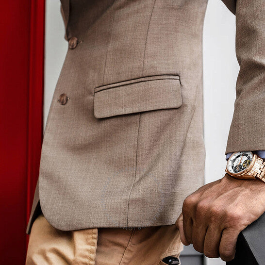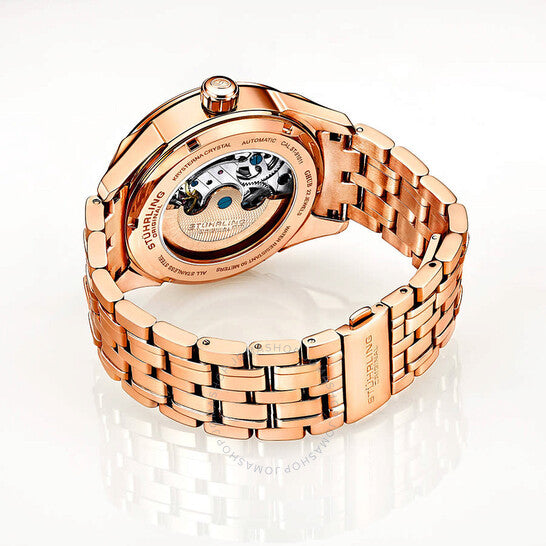علبة من الفولاذ المقاوم للصدأ بلون الذهب الوردي مع سوار من الفولاذ المقاوم للصدأ بلون الذهب الوردي. إطار ثابت من الفولاذ المقاوم للصدأ بلون الذهب الوردي. ميناء فضي اللون مع عقارب على شكل حرف ألفا بلون الذهب الوردي وعلامات ساعات مؤشرة. مقياس دقائق حول الحافة الداخلية. نوع الميناء: تناظري. مؤشران للنهار/الليل وميناءان فرعيان للوقت المزدوج. حركة أوتوماتيكية. كريستال كريستينا مقاوم للخدش. تاج قابل للسحب/الدفع. غطاء خلفي شفاف. شكل دائري، حجم العلبة: 42 مم، سمك العلبة: 12.5 مم. طول السوار: 7.5 بوصة. مشبك قابل للطي بزر ضغط. مقاومة للماء حتى عمق 50 مترًا / 165 قدمًا. الوظائف: الساعة، الدقائق، الوقت المزدوج، الليل/النهار. طراز ساعة رسمية. ساعة ستورلينج أوريجينال ليجاسي أوتوماتيكية للرجال بمينا فضي. ساعة ستورلينج أوريجينال ليجاسي أوتوماتيكية للرجال بمينا فضي M13481