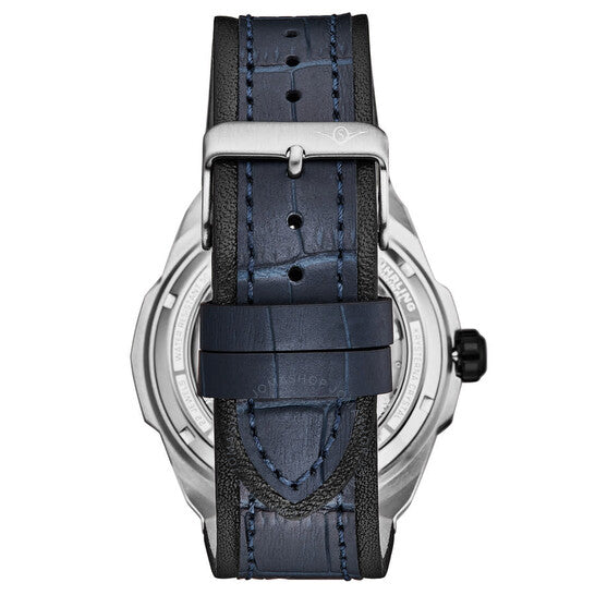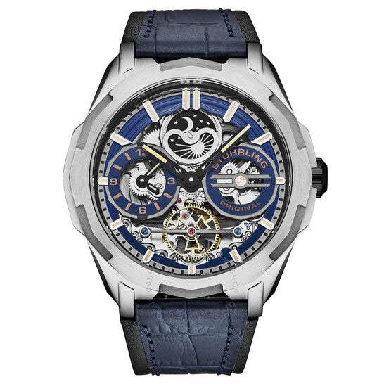 علبة من الفولاذ المقاوم للصدأ - تاج أسود مطلي بالأيونات - ميناء أزرق/أسود - سوار أزرق/أسود بإبزيم من الفولاذ المقاوم للصدأ. علبة فضية اللون من الفولاذ المقاوم للصدأ مع سوار جلدي أزرق. إطار ثابت من الفولاذ المقاوم للصدأ فضي اللون. ميناء أزرق مع عقارب وعلامات ساعات سوداء. علامات دقائق حول الحافة الخارجية. نوع الميناء: تناظري. عقارب وعلامات مضيئة. حركة أوتوماتيكية. غطاء خلفي شفاف. شكل العلبة دائري، مقاسها: 46 مم. مشبك تانغ. مقاومة للماء حتى عمق 50 مترًا / 165 قدمًا. الوظائف: كرونوغراف، ساعات، دقائق، ثوانٍ. سلسلة ليجاسي. ساعة رسمية. ساعة ستوهرلينغ الأصلية ليجاسي كرونوغراف أوتوماتيكية بمينا زرقاء للرجال M18221.