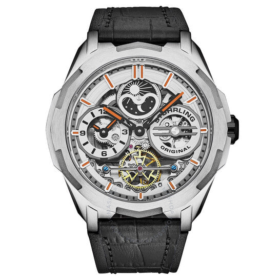 علبة من الفولاذ المقاوم للصدأ - تاج أسود مطلي بالأيونات - ميناء أبيض/أسود - سوار أسود بإبزيم من الفولاذ المقاوم للصدأ. علبة من الفولاذ المقاوم للصدأ فضية اللون مع سوار جلدي أسود. إطار ثابت من الفولاذ المقاوم للصدأ فضي اللون. ميناء فضي اللون مع عقارب وعلامات ساعات سوداء. علامات دقائق حول الحافة الخارجية. نوع الميناء: تناظري. عقارب وعلامات مضيئة. حركة أوتوماتيكية. غطاء خلفي شفاف. شكل العلبة دائري، مقاسها: 46 مم. مشبك تانغ. مقاومة للماء حتى عمق 50 مترًا / 165 قدمًا. الوظائف: كرونوغراف، ساعات، دقائق، ثوانٍ. سلسلة ليجاسي. ساعة رسمية. ساعة ستورلينج أوريجينال ليجاسي كرونوغراف أوتوماتيكية للرجال بمينا فضية، طراز M18219.