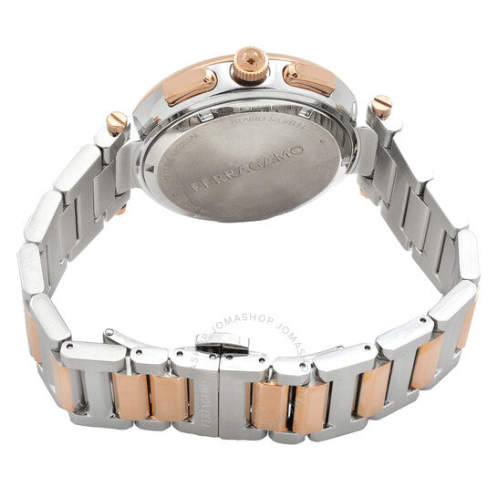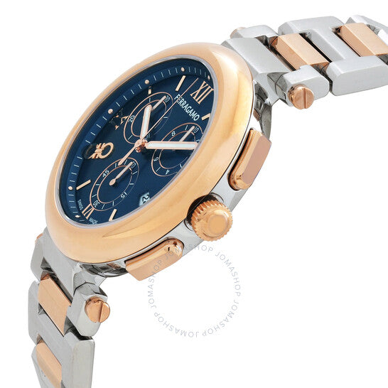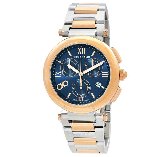 علبة فضية اللون من الفولاذ المقاوم للصدأ مع سوار من الفولاذ المقاوم للصدأ ثنائي اللون (فضي وذهبي وردي). إطار ثابت من الفولاذ المقاوم للصدأ بلون ذهبي وردي. ميناء أزرق بعقارب بلون ذهبي وردي وعلامات ساعات بأرقام رومانية. حلية مزدوجة عند موضع الساعة 8. علامات دقائق حول الحافة الخارجية. نوع الميناء: تناظري. عرض التاريخ عند موضع الساعة 4. كرونوغراف - ثلاثة أقراص فرعية تعرض: 60 ثانية، 30 دقيقة، و1/10 من الثانية. آلية حركة كوارتز. زجاج ياقوت مقاوم للخدش. تاج قابل للسحب/الدفع. غطاء خلفي صلب. شكل دائري، حجم العلبة: 40 مم. مشبك قابل للطي. مقاومة للماء حتى عمق 50 مترًا / 165 قدمًا. الوظائف: كرونوغراف، تاريخ، ساعة، دقيقة، ثانية. سلسلة ليجاسي. طراز ساعة رياضية. علامة الساعة: صناعة سويسرية. ساعة فيراغامو ليجاسي كرونوغراف كوارتز نسائية بمينا زرقاء SFU200523.