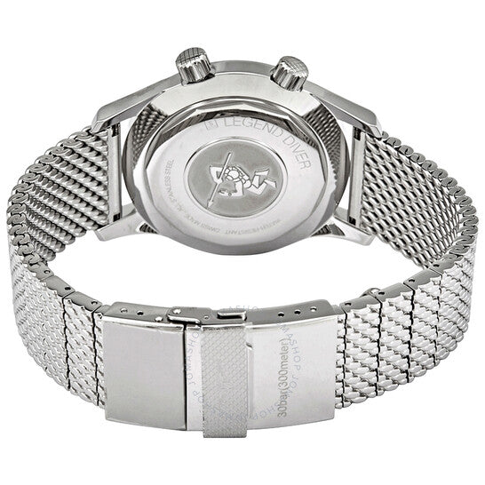 علبة من الفولاذ المقاوم للصدأ فضية اللون مع سوار شبكي فضي اللون. فولاذ مقاوم للصدأ فضي اللون ثابت. حافة غوص داخلية دوارة. إطار. ميناء مطلي باللون الأسود مع عقارب فضية اللون مضيئة على شكل سهم وعلامات ساعات. أرقام عربية تشير إلى مواقع الساعات 6 و9 و12. علامات دقائق حول الحافة الخارجية. نوع الميناء: تناظري. عقارب وعلامات مضيئة. عرض التاريخ عند موضع الساعة 3. حركة لونجين كاليبر L619/888 أوتوماتيكية، مبنية على ETA 2892، تحتوي على 21 جوهرة، تنبض بمعدل 25200 ذبذبة في الساعة، ولديها احتياطي طاقة لمدة 64 ساعة تقريبًا. كريستال ياقوت مقاوم للخدش. تاج لولبي. غطاء خلفي صلب. شكل دائري، حجم العلبة: 42 مم، سمك العلبة: 12.7 مم. عرض السوار: 22 مم. مشبك قابل للطي. مقاومة للماء حتى عمق 300 متر / 1000 قدم. الوظائف: التاريخ، الساعة، الدقيقة، الثانية. سلسلة ليجند دايفر. طراز ساعة غوص. علامة الساعة: صناعة سويسرية. ساعة لونجين ليجند دايفر أوتوماتيكية للرجال L3.774.4.50.6.