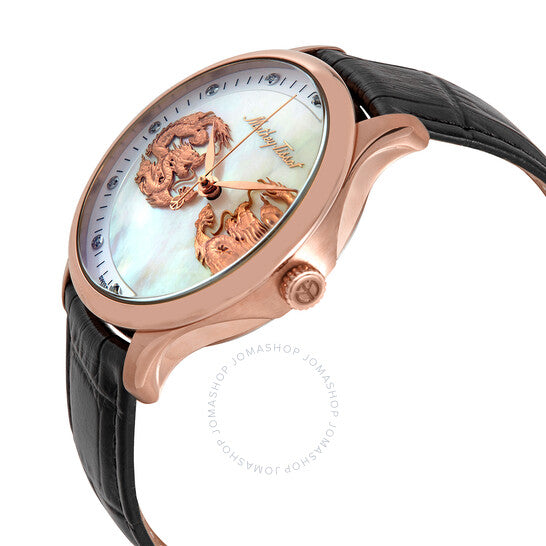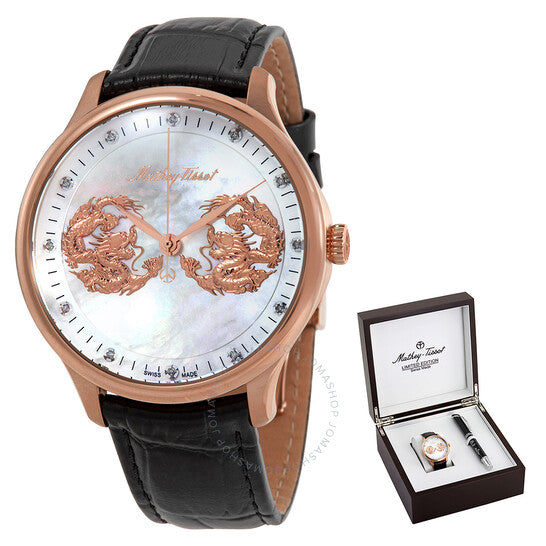 علبة من الفولاذ المقاوم للصدأ مطلية بالذهب الوردي بتقنية PVD مع سوار جلدي أسود. إطار ثابت مطلي بالذهب الوردي بتقنية PVD. ميناء من عرق اللؤلؤ (نقش تنين) مع عقارب بلون الذهب الوردي وعلامات ساعات من الماس. علامات دقائق حول الحافة الخارجية. نوع الميناء: تناظري. حركة أوتوماتيكية باحتياطي طاقة لمدة 44 ساعة. زجاج من الياقوت المقاوم للخدش. تاج قابل للسحب/الدفع. غطاء خلفي شفاف. شكل دائري. حجم العلبة: 42 مم. سمكها: 11 مم. عرض السوار: 23 مم. مشبك قابل للطي بزر ضغط. مقاومة للماء حتى عمق 50 مترًا / 165 قدمًا. الوظائف: الساعات، الدقائق، الثواني. إصدار محدود من سلسلة دراغون. طراز ساعة رسمية. علامة الساعة: صناعة سويسرية. ساعة ماثي تيسوت دراغون أوتوماتيكية للرجال، إصدار محدود، مرصعة بالماس، طراز H1886PI1.