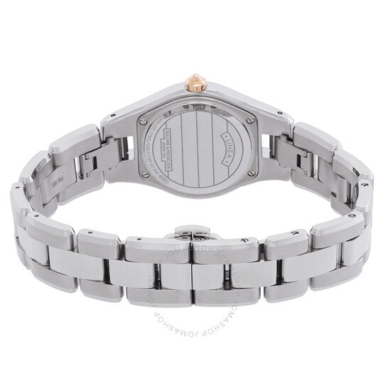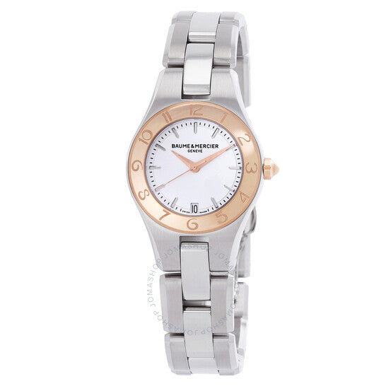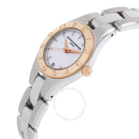 علبة وسوار من الفولاذ المقاوم للصدأ فضي اللون. إطار ثابت بلون الذهب الوردي. ميناء فضي اللون مع عقارب ومؤشرات ساعات ذهبية اللون. مؤشرات ساعات حول الحافة الخارجية. نوع الميناء: تناظري. عرض التاريخ عند موضع الساعة السادسة. حركة كوارتز. زجاج ياقوت مقاوم للخدش. تاج قابل للسحب/الدفع. غطاء خلفي صلب. شكل دائري، مقاس العلبة: ٢٧ مم. مشبك قابل للطي. مقاومة للماء حتى عمق ٥٠ مترًا / ١٦٥ قدمًا. الوظائف: التاريخ، الساعة، الدقيقة، الثانية. سلسلة Linea. اسم الساعة: صناعة سويسرية. ساعة Baume et Mercier Linea كوارتز نسائية بمينا فضي M0A10079.