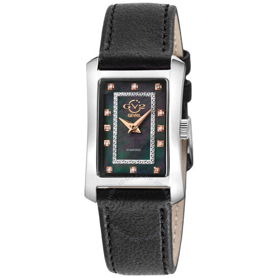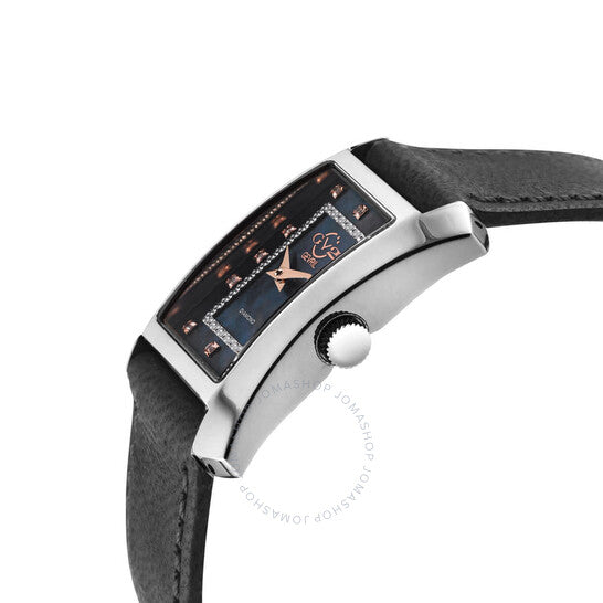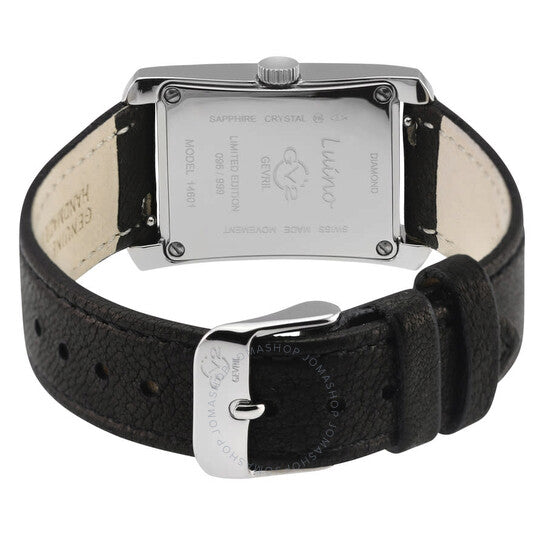 علبة من الفولاذ المقاوم للصدأ فضية اللون مع سوار من الجلد الأصلي الأسود. إطار ثابت من الفولاذ المقاوم للصدأ فضي اللون. ميناء من عرق اللؤلؤ مع عقارب من الذهب الوردي وعلامات ساعات من الألماس. نوع الميناء: تناظري. حركة كوارتز. زجاج من الياقوت المقاوم للخدش. تاج قابل للسحب/الدفع. غطاء خلفي صلب. شكل العلبة مستطيل، مقاس العلبة: ٢٩ مم، سمكها: ٩ مم. عرض السوار: ١٨ مم. مشبك بإبزيم. مقاومة للماء حتى عمق ٥٠ مترًا / ١٦٥ قدمًا. الوظائف: الساعات، الدقائق. معلومات إضافية: ١٢ ماسة. سلسلة لوينو. ساعة أنيقة. ساعة لوينو كوارتز نسائية مرصعة بالألماس من GV2 من جيفريل، طراز ١٤٦٠١.