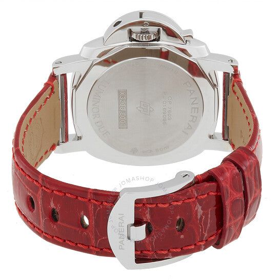 علبة فضية اللون من الفولاذ المقاوم للصدأ مع سوار جلدي أحمر. إطار ثابت من الفولاذ المقاوم للصدأ. ميناء عاجي بمؤشرات ساعات بأرقام عربية. نوع الميناء: تناظري. عرض التاريخ عند موضع الساعة 3. ميناء فرعي واحد يعرض الثواني الصغيرة. حركة بانراي كاليبر P.900 أوتوماتيكية، مستوحاة من بانراي OP XXXIV، تحتوي على 25 جوهرة، تنبض بتردد 28800 ذبذبة في الساعة، ولديها احتياطي طاقة يدوم حوالي 72 ساعة. زجاج من الياقوت المقاوم للخدش. تاج قابل للسحب/الدفع. غطاء خلفي صلب. حجم العلبة: 38 مم. مشبك تانغ. مقاومة للماء حتى عمق 30 مترًا / 100 قدم. الوظائف: التاريخ، الساعة، الدقائق، الثواني الصغيرة. سلسلة لومينور ديو. تصميم ساعة فاخرة. علامة الساعة: صناعة سويسرية. ساعة بانراي لومينور ديو أوتوماتيكية نسائية PAM01248.