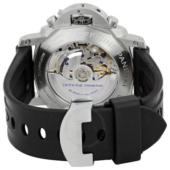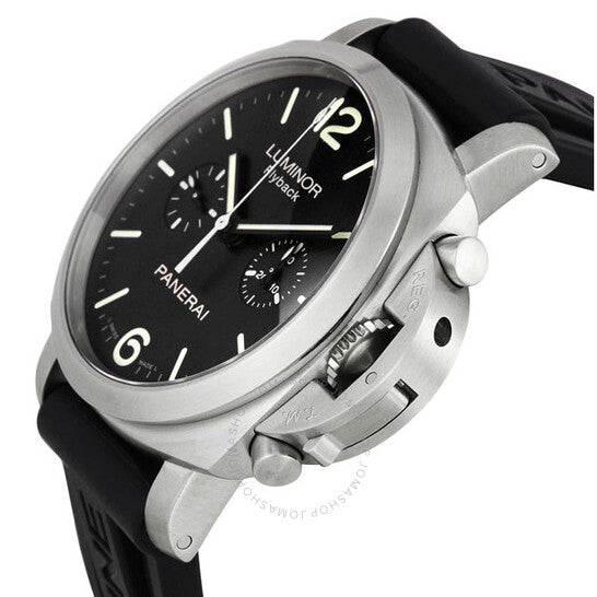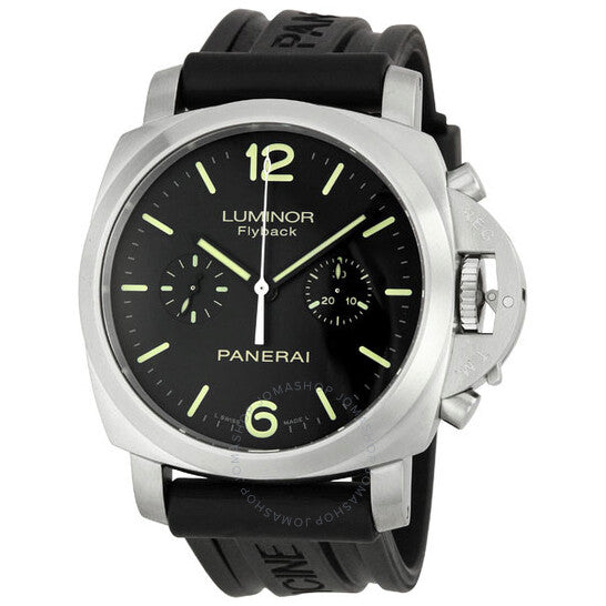 علبة فضية اللون من الفولاذ المقاوم للصدأ مع سوار مطاطي أسود. إطار ثابت فضي اللون من الفولاذ المقاوم للصدأ. ميناء أسود بعقارب مضيئة وعلامات ساعات على شكل عصا. أرقام عربية تُشير إلى موضعي الساعة السادسة والثانية عشرة. نوع الميناء: تناظري. عقارب وعلامات مضيئة. كرونوغراف - ميناءان فرعيان يعرضان: 60 ثانية و30 دقيقة. يسمح كرونوغراف فلاي باك بإعادة تشغيل الكرونوغراف فورًا بالضغط على الزر السفلي أثناء ضبط الوقت. حركة بانيراي كاليبر OP XIX أوتوماتيكية، مبنية على ETA 7750، تحتوي على 30 جوهرة، تنبض بمعدل 28800 ذبذبة في الساعة، ولديها احتياطي طاقة لمدة 42 ساعة تقريبًا. زجاج ياقوت مقاوم للخدش. تاج فولاذي محمي. ظهر هيكلي. شكل العلبة وسادة، حجم العلبة: 44 مم، سمك العلبة: 17 مم. مشبك قابل للتعديل من الفولاذ المقاوم للصدأ. مقاومة للماء حتى عمق 100 متر / 330 قدمًا. الوظائف: كرونوغراف، فلاي باك، ساعات، دقائق، ثوانٍ صغيرة، تاكيمتر. طراز ساعة رياضية. علامة الساعة: صناعة سويسرية. ساعة بانيراي لومينور فلاي باك كرونوغراف ١٩٥٠ للرجال، الرقم المرجعي PAM00361.