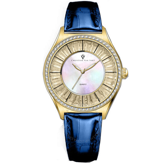 علبة من الفولاذ المقاوم للصدأ بلون الذهب الأصفر مع سوار جلدي أزرق. إطار ثابت من الفولاذ المقاوم للصدأ بلون الذهب الأصفر. ميناء من عرق اللؤلؤ مع عقارب بلون الذهب الأصفر. نوع الميناء: تناظري. حركة كوارتز. زجاج معدني مقاوم للخدش. شكل العلبة دائري، مقاسها: 40 مم، سُمكها: 10 مم. عرض السوار: 14 مم، طوله: 7.5 بوصة. مقاومة للماء حتى عمق 3 أمتار. وظائفها: الساعات، الدقائق، الثواني. سلسلة لونا. ساعة أنيقة. ساعة كريستيان فان سانت لونا كوارتز نسائية CV3203.
