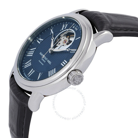 علبة من الفولاذ المقاوم للصدأ فضية اللون مع سوار جلدي أسود. إطار ثابت من الفولاذ المقاوم للصدأ فضي اللون. ميناء أزرق بعقارب فضية اللون وعلامات ساعات بأرقام رومانية. علامات دقائق حول الحافة الخارجية. نوع الميناء: تناظري. حركة أوتوماتيكية. زجاج ياقوت مقاوم للخدش. تاج قابل للسحب/الدفع. غطاء خلفي شفاف. شكل العلبة دائري، مقاسها: 39.5 مم. مشبك بإبزيم. مقاومة للماء حتى عمق 50 مترًا / 165 قدمًا. الوظائف: الساعات، الدقائق، الثواني. سلسلة مايسترو. طراز ساعة رسمية. علامة الساعة: صناعة سويسرية. ساعة ريموند ويل مايسترو أوتوماتيكية للرجال بمينا أزرق 2827-STC-00508.