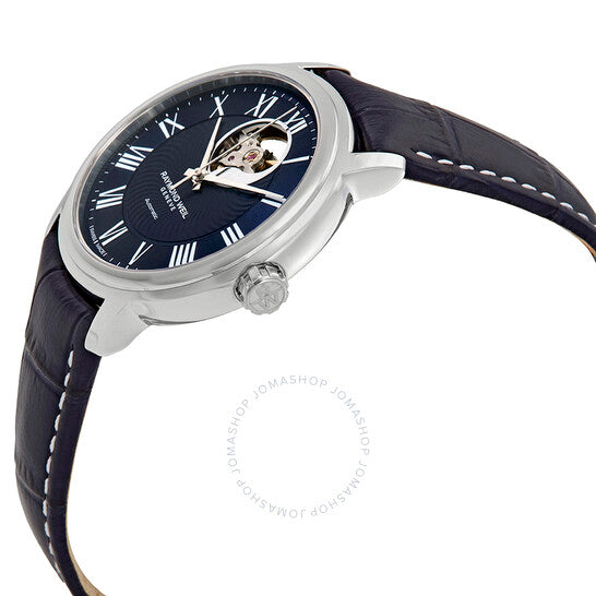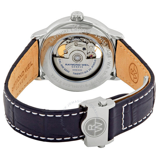 علبة من الفولاذ المقاوم للصدأ مع سوار من جلد العجل الأزرق. إطار ثابت من الفولاذ المقاوم للصدأ. ميناء أزرق داكن (قلب مفتوح) بعقارب فضية اللون وعلامات ساعات بأرقام رومانية. علامات دقائق حول الحافة الخارجية. نوع الميناء: تناظري. حركة أوتوماتيكية من ريموند ويل كاليبر RW 4200، مبنية على سيليتا SW-200، تحتوي على 25 جوهرة، تنبض بمعدل 28800 ذبذبة في الساعة، ولديها احتياطي طاقة لمدة 38 ساعة تقريبًا. زجاج من الياقوت المقاوم للخدش. تاج قابل للسحب/الدفع. غطاء خلفي شفاف. شكل دائري. حجم العلبة: 40 مم. سمكها: 9.2 مم. مشبك قابل للطي. مقاومة للماء حتى عمق 50 مترًا / 165 قدمًا. الوظائف: الساعات، الدقائق، الثواني. سلسلة مايسترو. طراز ساعة رسمية. علامة الساعة: صناعة سويسرية. ساعة ريموند ويل مايسترو أوتوماتيكية للرجال من الجلد 2227-STC-00508.