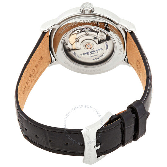 علبة من الفولاذ المقاوم للصدأ فضية اللون مع سوار جلدي أسود. إطار ثابت من الفولاذ المقاوم للصدأ فضي اللون. ميناء أخضر بعقارب فضية اللون وعلامات ساعات رومانية. علامات دقائق حول الحافة الخارجية. نوع الميناء: تناظري. عرض التاريخ عند موضع الساعة 3. حركة أوتوماتيكية. زجاج ياقوت مقاوم للخدش. تاج قابل للسحب/الدفع. غطاء خلفي شفاف. شكل العلبة دائري، مقاسها: 39 مم، سمكها: 9.2 مم. عرض السوار: 19 مم. مشبك تانغ. مقاومة للماء حتى عمق 50 مترًا / 165 قدمًا. الوظائف: التاريخ، الساعة، الدقائق، الثواني. سلسلة مايسترو. علامة الساعة: صناعة سويسرية. ساعة ريموند ويل مايسترو أوتوماتيكية للرجال 2837-STC-00520.