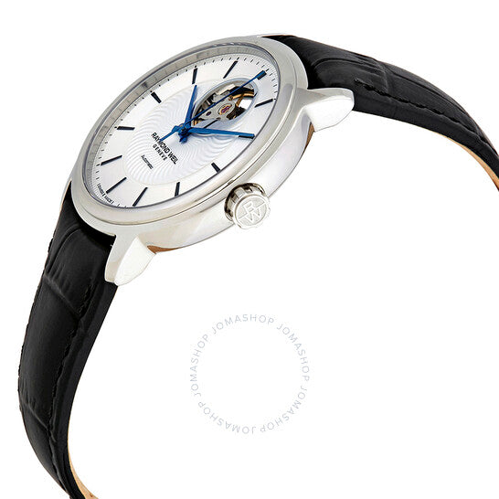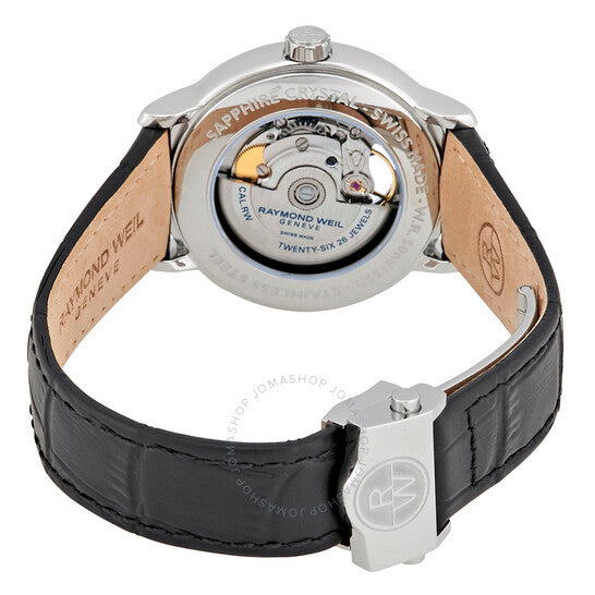 علبة من الفولاذ المقاوم للصدأ مع سوار جلدي أسود. إطار ثابت من الفولاذ المقاوم للصدأ. ميناء فضي (قلب مفتوح) بعقارب زرقاء وعلامات ساعات مؤشرة. علامات دقائق حول الحافة الخارجية. نوع الميناء: تناظري. حركة أوتوماتيكية من ريموند ويل، عيار RW 4200، مبنية على سيليتا SW-200، تحتوي على 25 جوهرة، تنبض بمعدل 28800 ذبذبة في الساعة، ولديها احتياطي طاقة لمدة 38 ساعة تقريبًا. زجاج ياقوتي مقاوم للخدش. تاج قابل للسحب/الدفع. غطاء خلفي شفاف. شكل دائري. حجم العلبة: 39 مم. سمكها: 9 مم. عرض السوار: 20 مم. مشبك قابل للطي. مقاومة للماء حتى عمق 50 مترًا / 165 قدمًا. الوظائف: الساعات، الدقائق، الثواني. معلومات إضافية: مناسبة بشكل عام للسباحة الترفيهية القصيرة، ولكنها ليست مناسبة للغوص أو الغطس السطحي. سلسلة مايسترو. تصميم ساعة فاخرة. علامة الساعة: صناعة سويسرية. ساعة ريموند ويل مايسترو أوتوماتيكية للرجال بمينا فضي 2227-STC-65001.